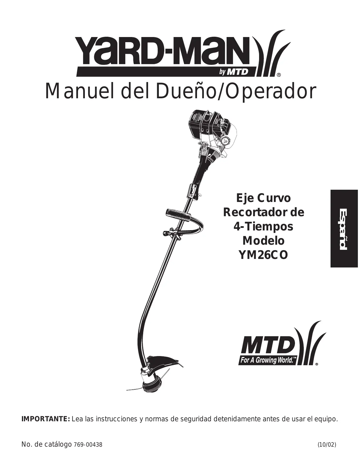 YARD-MAN )/ by MTD Manuel del Dueño/Operador Eje Curvo Recortador de 4-Tiempos Modelo YM26CO {For À Growing Word."] MTD)// IMPORTANTE: Lea las instrucciones y normas de seguridad detenidamente antes de usar el equipo. No. de catélogo 769-00438 (10/02)
