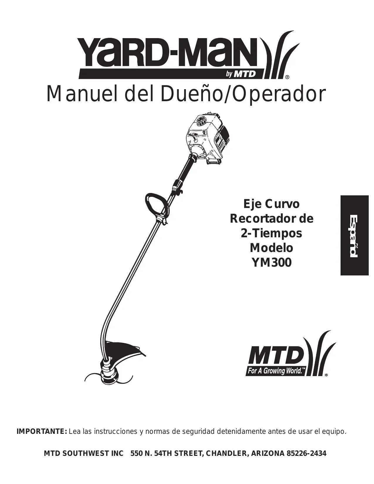 YARD-MAN )/ by MTD Manuel del Dueño/Operador Eje Curvo Recortador de 2-Tiempos Modelo YM300 {For À Growing Word."] MTD)// IMPORTANTE: Lea las instrucciones y normas de seguridad detenidamente antes de usar el equipo. MTD SOUTHWEST INC 550 N. 54TH STREET, CHANDLER, ARIZONA 85226-2434