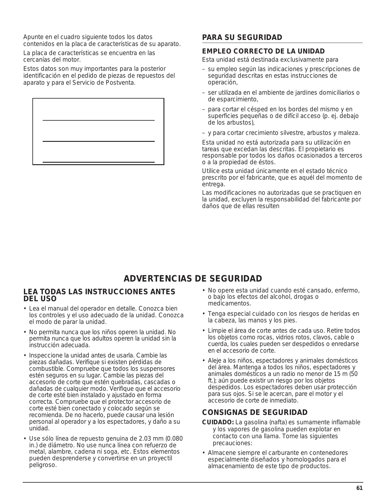 Esta unidad está destinada exclusivamente para – su empleo según las indicaciones y prescripciones de seguridad descritas en estas instrucciones de operación, – ser utilizada en el ambiente de jardines domiciliarios o de esparcimiento, – para cortar el césped en los bordes del mismo y en superficies pequeñas o de difícil acceso (p. ej. debajo de los arbustos), – y para cortar crecimiento silvestre, arbustos y maleza. Esta unidad no está autorizada para su utilización en tareas que excedan las descritas. El propietario es responsable por todos los daños ocasionados a terceros o a la propiedad de éstos. Utilice esta unidad únicamente en el estado técnico prescrito por el fabricante, que es aquél del momento de entrega. Las modificaciones no autorizadas que se practiquen en la unidad, excluyen la responsabilidad del fabricante por daños que de ellas resulten