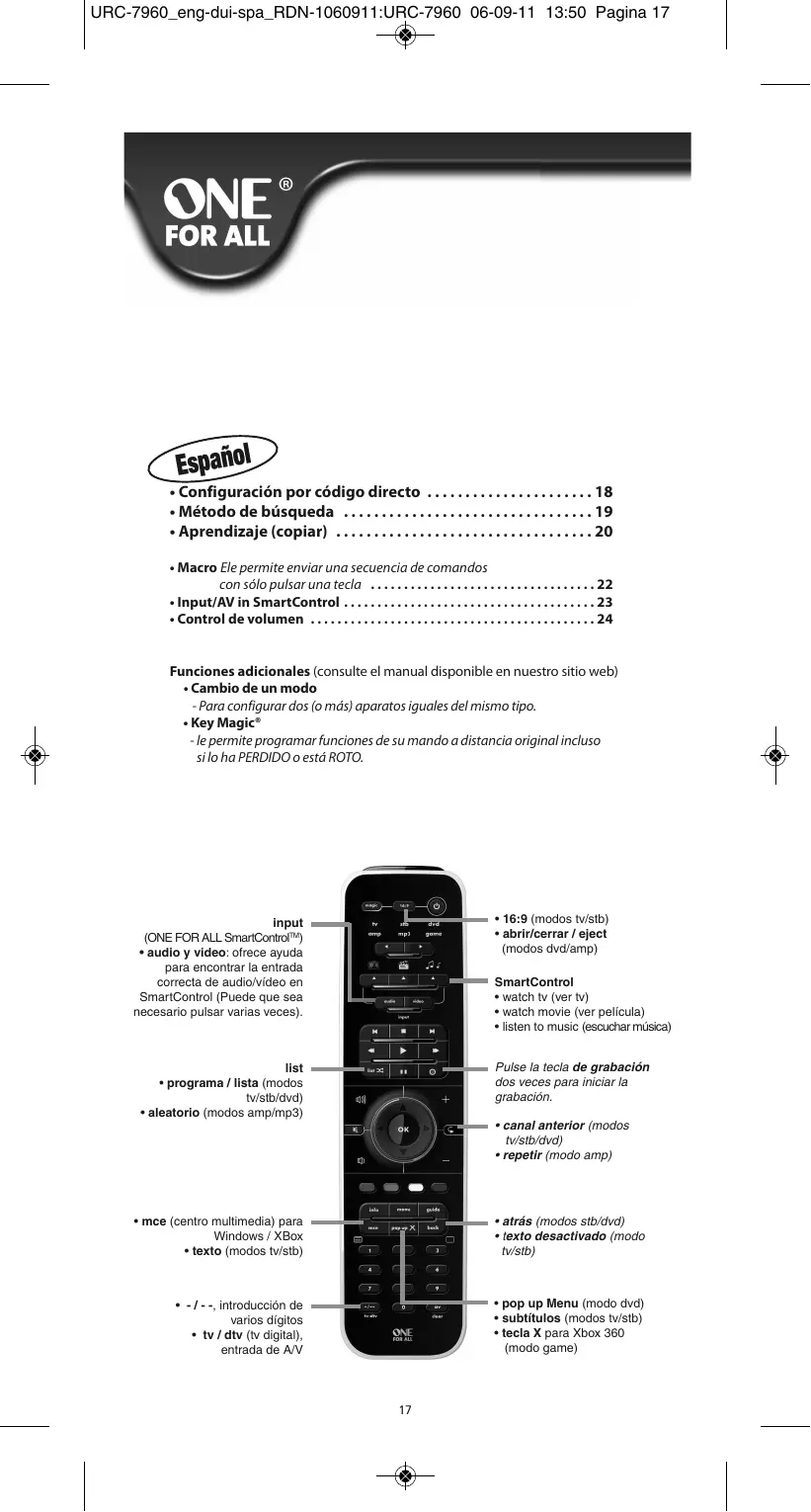 URC-7960, URC 7962 - Mando a distancia universal ONE FOR ALL - Manual de uso y guía de instrucciones gratis