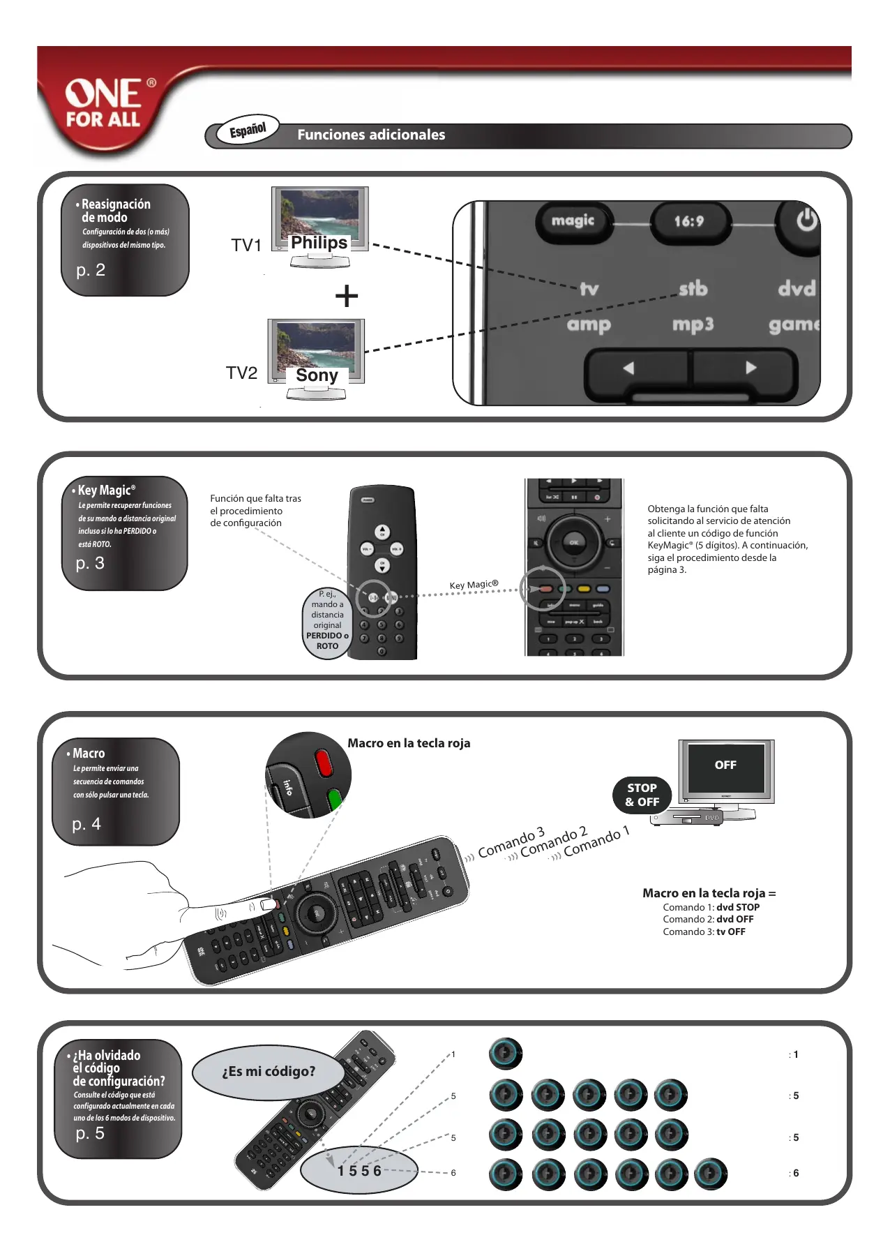 KeyMagic® es una función exclusiva de ONE FOR ALL. El diseño de ONE FOR ALL garantiza el uso de muchas de las funciones del mando a distancia original, incluso aquellas que no tienen su propia tecla en el teclado ONE FOR ALL. Puede asignar las funciones que usa frecuentemente a la tecla que desee con la función KeyMagic® del mando ONE FOR ALL. Para programar una función con KeyMagic® necesita conocer el código de función correspondiente. Dado que los códigos de función varían en función del tipo de dispositivo, éstos no se pueden encontrar en el manual. Puede solicitar los códigos de función a través del teléfono de ayuda del servicio de atención al cliente o a través del correo postal, fax o correo electrónico. ofahelp@uebv.com