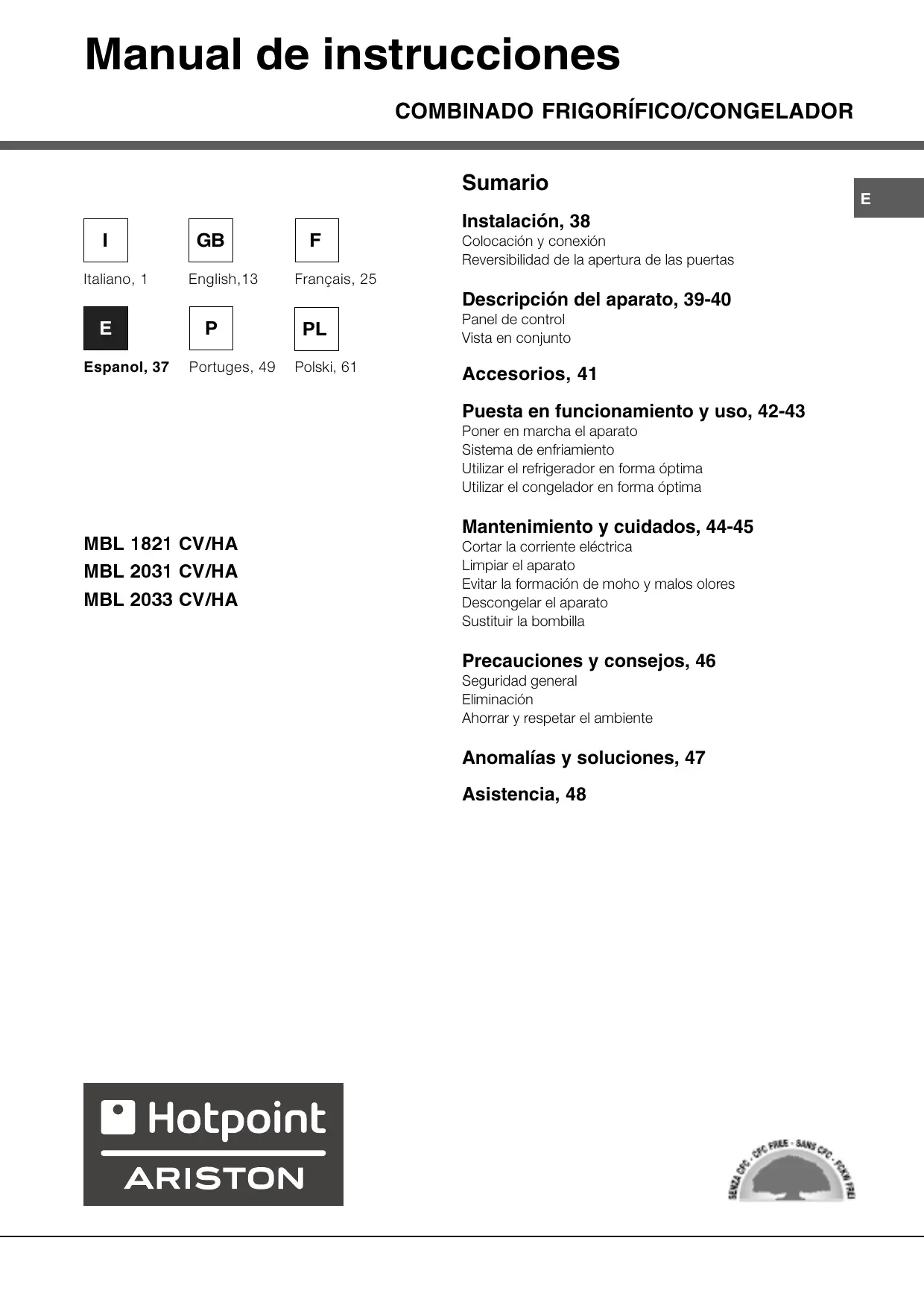 Encuentra gratis el manual del aparato MBL 2031 CV HOTPOINT-ARISTON en formato PDF.