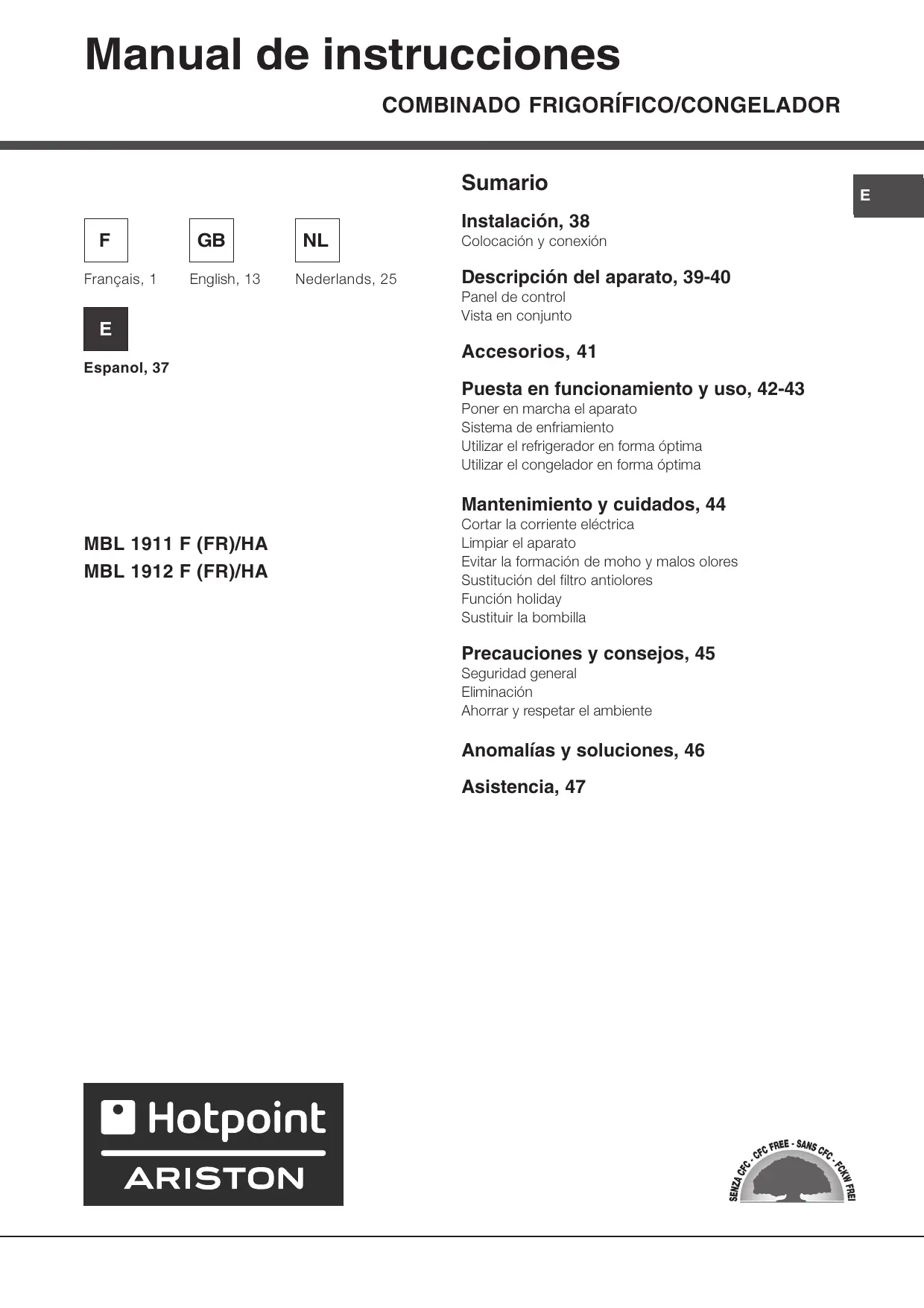 MBL 1912 F - Refrigerador HOTPOINT-ARISTON - Manual de uso y guía de instrucciones gratis