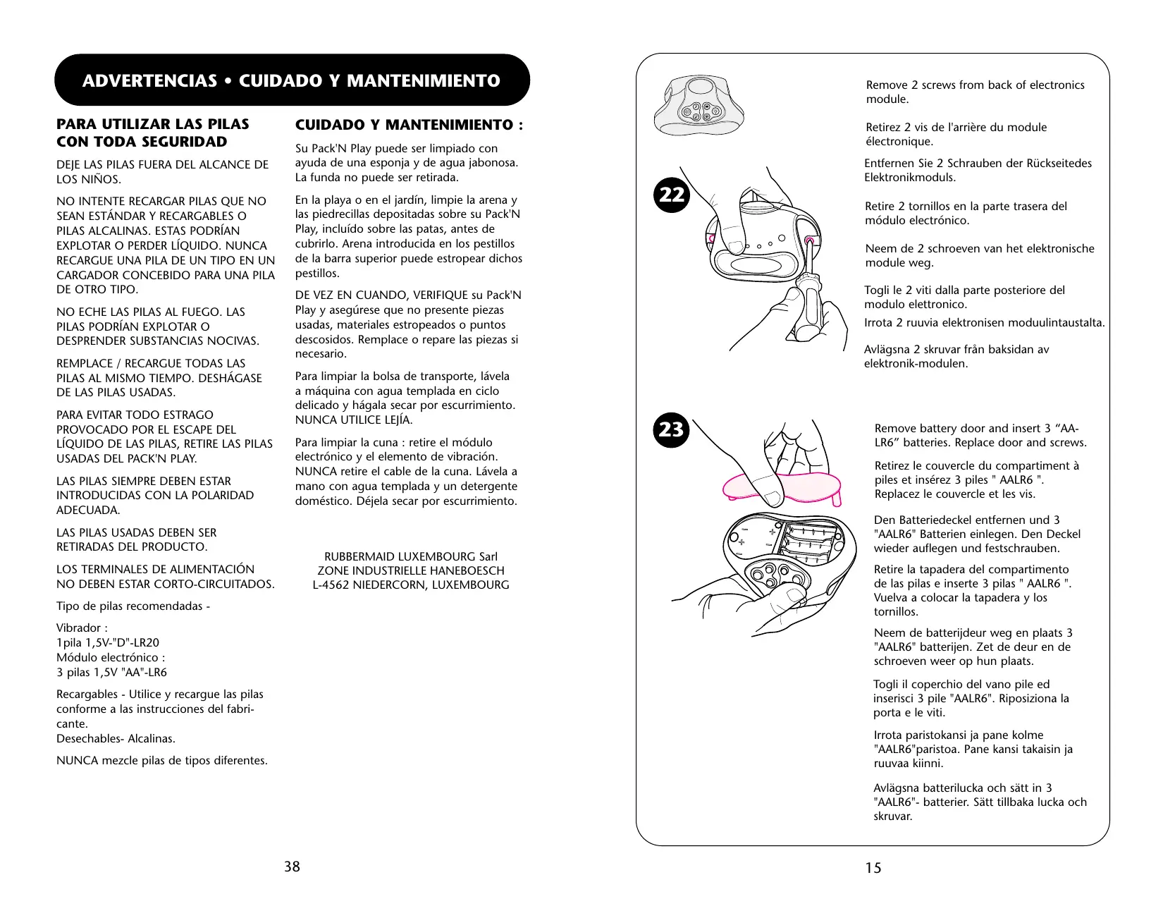 NO DEBEN ESTAR CORTO-CIRCUITADOS. Tipo de pilas recomendadas - Vibrador : Tpila 1,5V-"D"-LR20 Médulo electrénico : 3 pilas 1,5V "AA'-LR6 Recargables - Utilice y recargue las pilas conforme à las instrucciones del fabri- cante. Desechables- Alcalinas. NUNCA mezcle pilas de tipos diferentes. CUIDADO Y MANTENIMIENTO : Su Pack'N Play puede ser limpiado con ayuda de una esponja y de agua jabonosa. La funda no puede ser retirada. En la playa o en el jardin, limpie la arena y las piedrecillas depositadas sobre su Pack N Play, inclufdo sobre las patas, antes de cubrirlo. Arena introducida en los pestillos de la barra superior puede estropear dichos pestillos. DE VEZ EN CUANDO, VERIFIQUE su PacKN Play y asegürese que no presente piezas usadas, materiales estropeados o puntos descosidos. Remplace o repare las piezas si necesario. Para limpiar la bolsa de transporte, lévela à mquina con agua templada en ciclo delicado y hägala secar por escurrimiento. NUNCA UTILICE LEJIA. Para limpiar la cuna : retire el médulo electrônico y el elemento de vibraciôn. NUNCA retire el cable de la cuna. Lâvela a mano con agua templada y un detergente doméstico. Déjela secar por escurrimiento. RUBBERMAID LUXEMBOURG Sarl