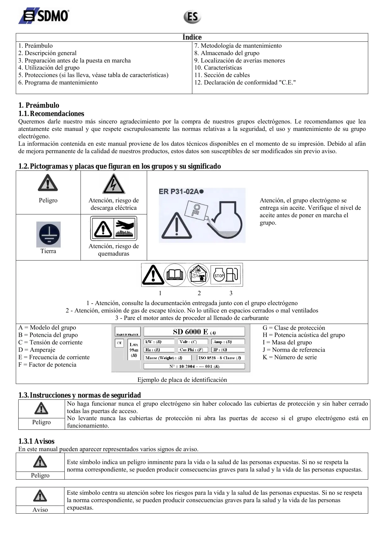 1.1. Recomendaciones Queremos darle nuestro más sincero agradecimiento por la compra de nuestros grupos electrógenos. Le recomendamos que lea atentamente este manual y que respete escrupulosamente las normas relativas a la seguridad, el uso y mantenimiento de su grupo electrógeno. La información contenida en este manual proviene de los datos técnicos disponibles en el momento de su impresión. Debido al afán de mejora permanente de la calidad de nuestros productos, estos datos son susceptibles de ser modificados sin previo aviso. 1.2. Pictogramas y placas que figuran en los grupos y su significado Peligro Tierra Atención, riesgo de descarga eléctrica Atención, el grupo electrógeno se entrega sin aceite. Verifique el nivel de aceite antes de poner en marcha el grupo. Atención, riesgo de quemaduras