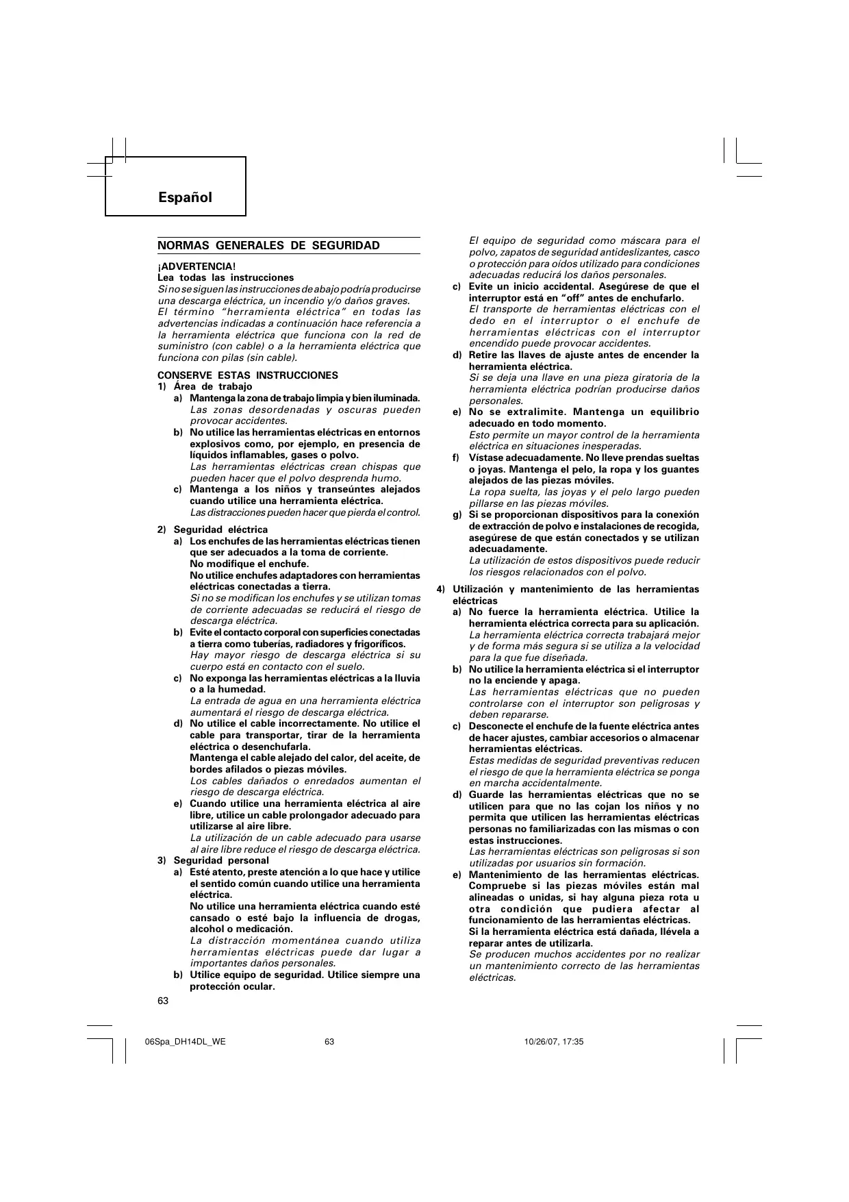 eléctricas a) No fuerce la herramienta eléctrica. Utilice la herramienta eléctrica correcta para su aplicación. La herramienta eléctrica correcta trabajará mejor y de forma más segura si se utiliza a la velocidad para la que fue diseñada. b) No utilice la herramienta eléctrica si el interruptor no la enciende y apaga. Las herramientas eléctricas que no pueden controlarse con el interruptor son peligrosas y deben repararse. c) Desconecte el enchufe de la fuente eléctrica antes de hacer ajustes, cambiar accesorios o almacenar herramientas eléctricas. Estas medidas de seguridad preventivas reducen el riesgo de que la herramienta eléctrica se ponga en marcha accidentalmente. d) Guarde las herramientas eléctricas que no se utilicen para que no las cojan los niños y no permita que utilicen las herramientas eléctricas personas no familiarizadas con las mismas o con estas instrucciones. Las herramientas eléctricas son peligrosas si son utilizadas por usuarios sin formación. e) Mantenimiento de las herramientas eléctricas. Compruebe si las piezas móviles están mal alineadas o unidas, si hay alguna pieza rota u otra condición que pudiera afectar al funcionamiento de las herramientas eléctricas. Si la herramienta eléctrica está dañada, llévela a reparar antes de utilizarla. Se producen muchos accidentes por no realizar un mantenimiento correcto de las herramientas eléctricas. 10/26/07, 17:35 Español f) Mantenga las herramientas de corte afiladas y limpias. Las herramientas de corte correctamente mantenidas con los bordes de corte afilados son más fáciles de controlar. g) Utilice la herramienta eléctrica, los accesorios y las brocas de la herramienta, etc., de acuerdo con estas instrucciones y de la manera adecuada para el tipo de herramienta eléctrica, teniendo en cuenta las condiciones laborales y el trabajo que se va a realizar. La utilización de la herramienta eléctrica para operaciones diferentes a pretendidas podría dar lugar a una situación peligrosa.