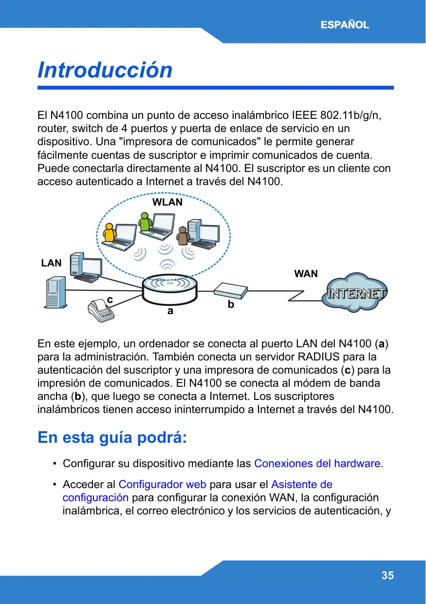 Introducción El N4100 combina un punto de acceso inalámbrico IEEE 802.11b/g/n, router, switch de 4 puertos y puerta de enlace de servicio en un dispositivo. Una "impresora de comunicados" le permite generar fácilmente cuentas de suscriptor e imprimir comunicados de cuenta. Puede conectarla directamente al N4100. El suscriptor es un cliente con acceso autenticado a Internet a través del N4100.