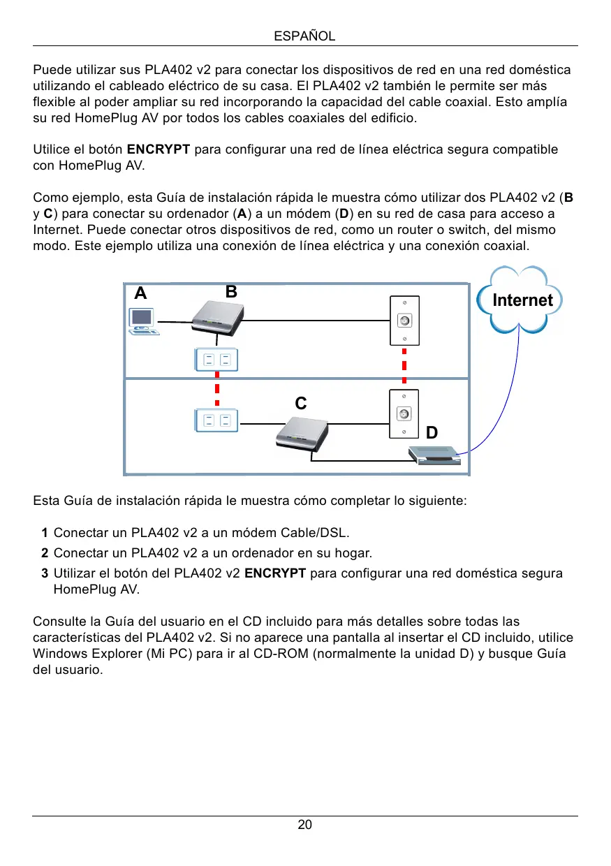 1 Conectar un PLA402 v2 a un módem Cable/DSL. 2 Conectar un PLA402 v2 a un ordenador en su hogar. 3 Utilizar el botón del PLA402 v2 ENCRYPT para configurar una red doméstica segura HomePlug AV. Consulte la Guía del usuario en el CD incluido para más detalles sobre todas las características del PLA402 v2. Si no aparece una pantalla al insertar el CD incluido, utilice Windows Explorer (Mi PC) para ir al CD-ROM (normalmente la unidad D) y busque Guía del usuario.