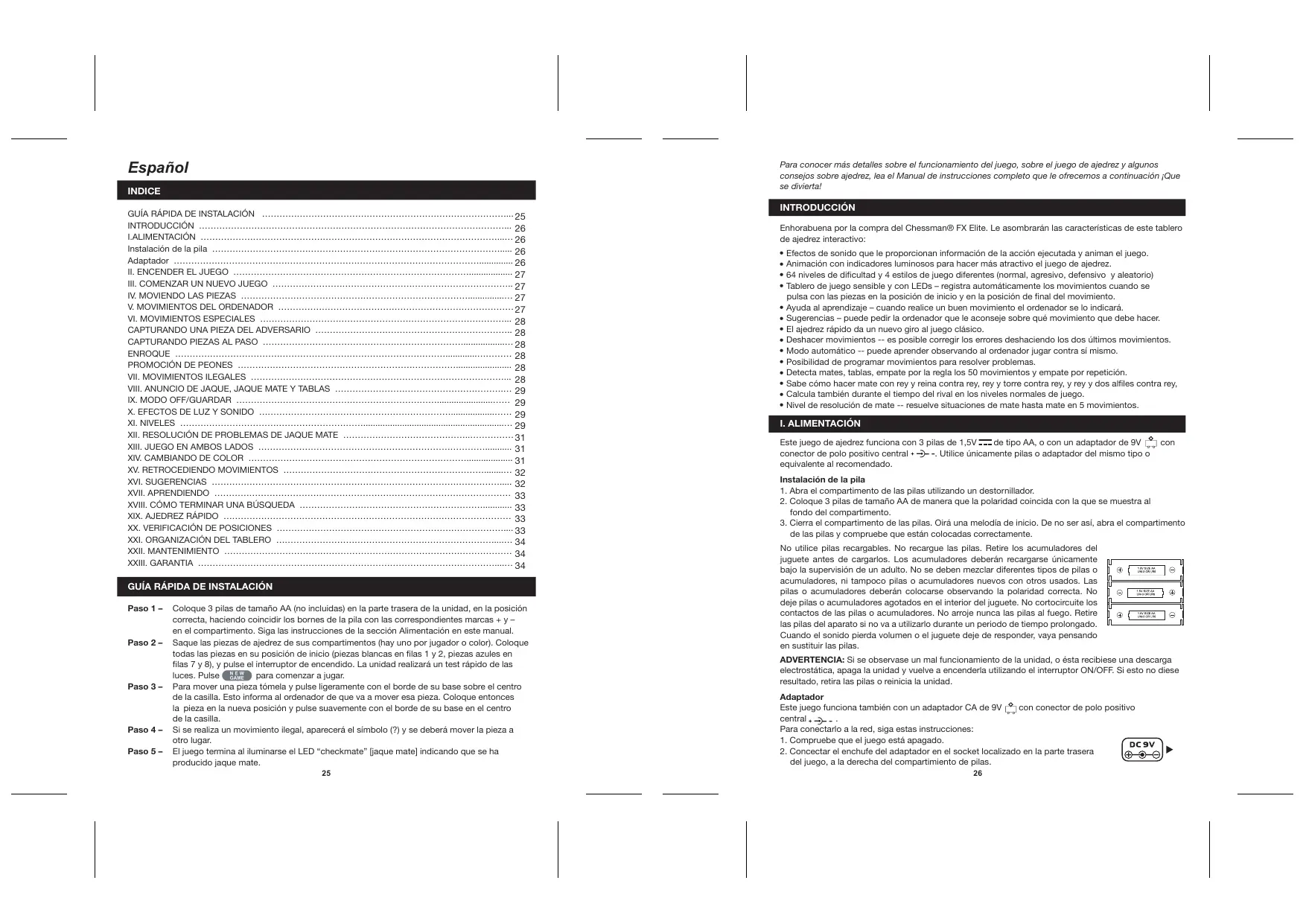 I. ALIMENTACIÓN Este juego de ajedrez funciona con 3 pilas de 1,5V de tipo AA, o con un adaptador de 9V conector de polo positivo central