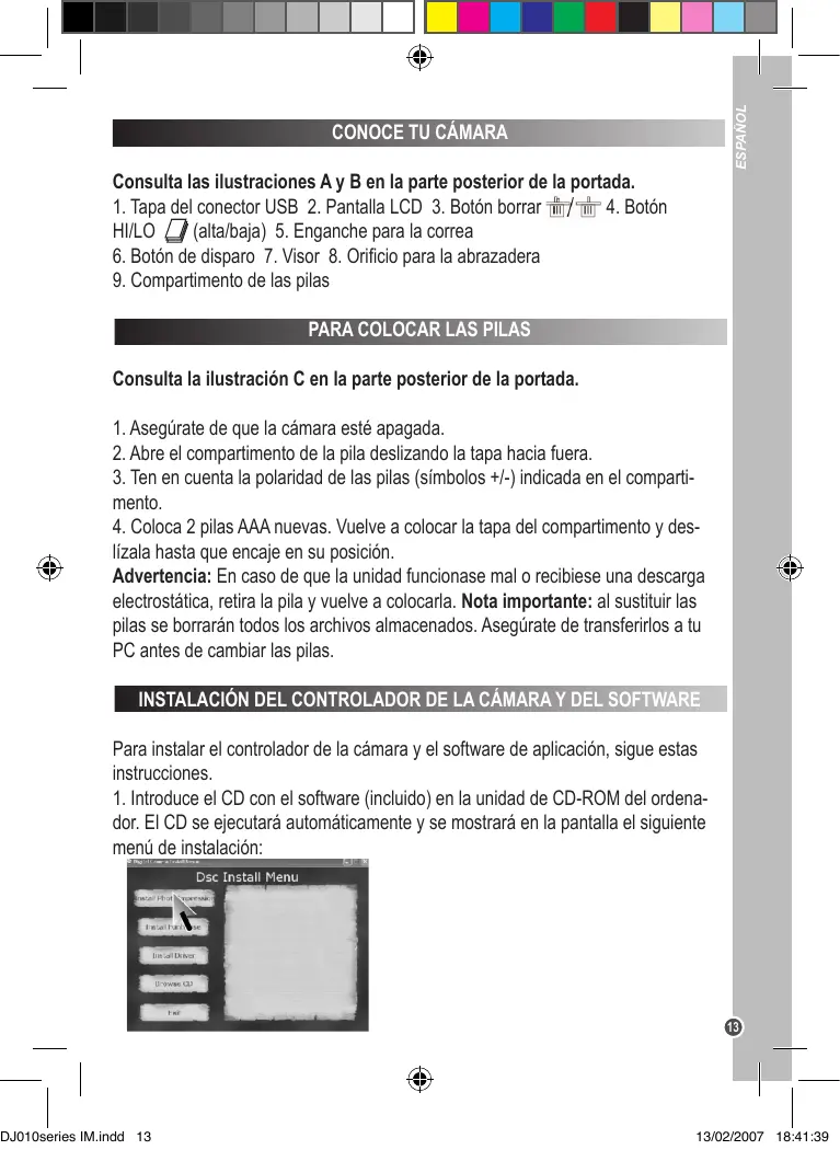 Advertencia: En caso de que la unidad funcionase mal o recibiese una descarga electrostática, retira la pila y vuelve a colocarla. Nota importante: al sustituir las pilas se borrarán todos los archivos almacenados. Asegúrate de transferirlos a tu PC antes de cambiar las pilas. INSTALACIÓN DEL CONTROLADOR DE LA CÁMARA Y DEL SOFTWARE Para instalar el controlador de la cámara y el software de aplicación, sigue estas instrucciones. 1. Introduce el CD con el software (incluido) en la unidad de CD-ROM del ordenador. El CD se ejecutará automáticamente y se mostrará en la pantalla el siguiente menú de instalación: Pulsa con el ratón en “Install driver” y sigue luego las instrucciones para instalarlo. Necesitarás reiniciar tu ordenador después de instalar el controlador. Nota: Si el CD no se ejecuta automáticamente, selecciona Inicio Ejecutar e introduce “D:\setup.exe” en el campo de texto del diálogo (sustituye “D:\” por la unidad de CD-ROM de tu ordenador).
