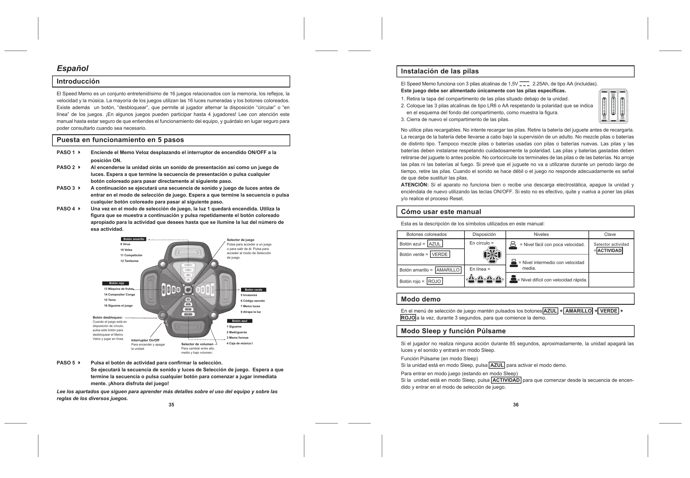 No utilise pilas recargables. No intente recargar las pilas. Retire la bateria del juguete antes de recargarla. La recarga de la bateria dele levarse a cabo bajo la supervision de un adulto.No mezcle pilas o baterias dedistinctioipo.Tampoco mezcle pilas o baterias usadas con pilas o baterias nuevas.Las pilas y las baterias deben instalarse respetando ciudadamente la polaridad.Las pilas y baterias gastadas deben retirarse del juguete lo antes possible.No cortocircuite los terminales de las pilas o de las baterias.No arroje las pilas ni las baterias al fuego.Si prevé que el juguete no va a utilizesare durante un periodo largo de tiempo,retire las pilas.Cuong el sonido se hace debil o el juego no responde adecadamente es seal de queDebe sustituir las pilas.