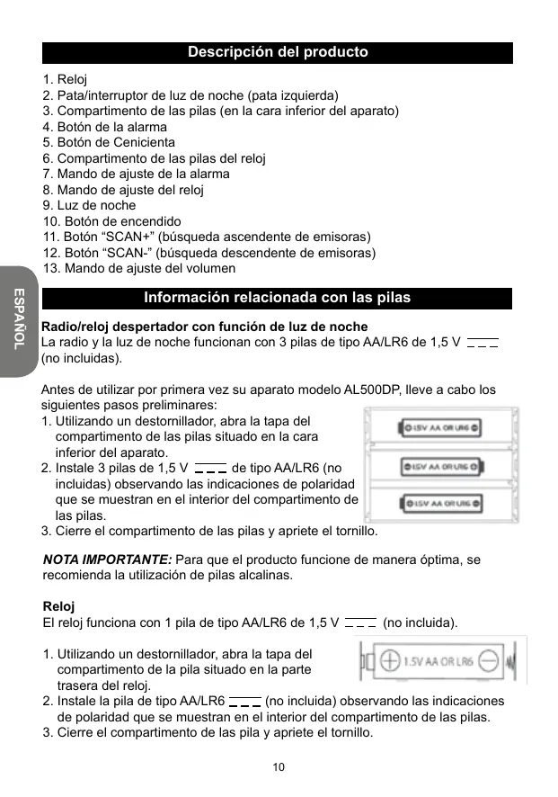 ESPAÑOL Información relacionada con las pilas Radio/reloj despertador con función de luz de noche La radio y la luz de noche funcionan con 3 pilas de tipo AA/LR6 de 1,5 V (no incluidas). Antes de utilizar por primera vez su aparato modelo AL500DP, lleve a cabo los siguientes pasos preliminares:
