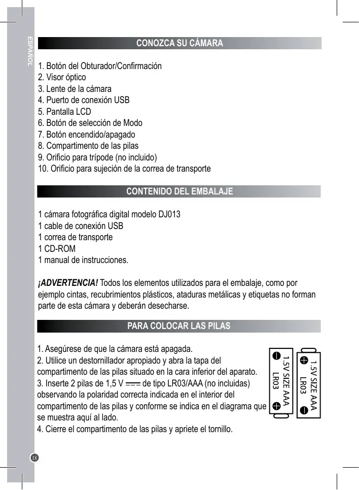 1 cámara fotográfica digital modelo DJ013 1 cable de conexión USB 1 correa de transporte 1 CD-ROM 1 manual de instrucciones. ¡ADVERTENCIA! Todos los elementos utilizados para el embalaje, como por ejemplo cintas, recubrimientos plásticos, ataduras metálicas y etiquetas no forman parte de esta cámara y deberán desecharse.