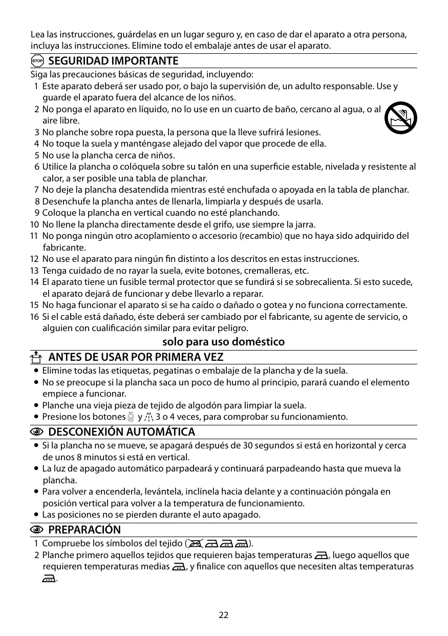 1 Este aparato deberá ser usado por, o bajo la supervisión de, un adulto responsable. Use y guarde el aparato fuera del alcance de los niños. 2 No ponga el aparato en líquido, no lo use en un cuarto de baño, cercano al agua, o al aire libre. 3 No planche sobre ropa puesta, la persona que la lleve sufrirá lesiones. 4 No toque la suela y manténgase alejado del vapor que procede de ella. 5 No use la plancha cerca de niños. 6 Utilice la plancha o colóquela sobre su talón en una superficie estable, nivelada y resistente al calor, a ser posible una tabla de planchar. 7 No deje la plancha desatendida mientras esté enchufada o apoyada en la tabla de planchar. 8 Desenchufe la plancha antes de llenarla, limpiarla y después de usarla. 9 Coloque la plancha en vertical cuando no esté planchando. 10 No llene la plancha directamente desde el grifo, use siempre la jarra. 11 No ponga ningún otro acoplamiento o accesorio (recambio) que no haya sido adquirido del fabricante. 12 No use el aparato para ningún fin distinto a los descritos en estas instrucciones. 13 Tenga cuidado de no rayar la suela, evite botones, cremalleras, etc. 14 El aparato tiene un fusible termal protector que se fundirá si se sobrecalienta. Si esto sucede, el aparato dejará de funcionar y debe llevarlo a reparar. 15 No haga funcionar el aparato si se ha caído o dañado o gotea y no funciona correctamente. 16 Si el cable está dañado, éste deberá ser cambiado por el fabricante, su agente de servicio, o alguien con cualificación similar para evitar peligro.