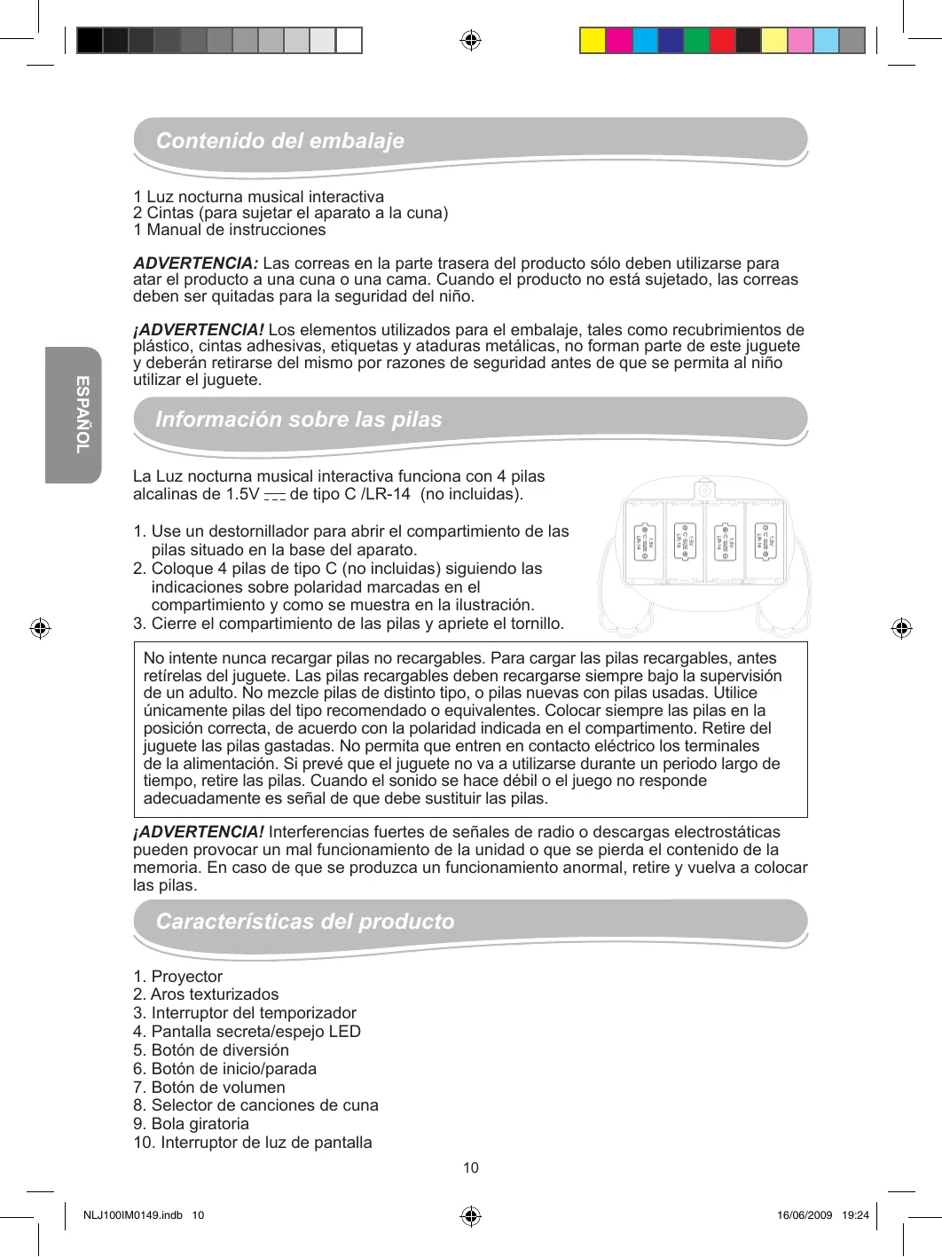 La Luz nocturna musical interactiva funciona con 4 pilas alcalinas de 1.5V de tipo C /LR-14 (no incluidas). 1. Use un destornillador para abrir el compartimiento de las pilas situado en la base del aparato. 2. Coloque 4 pilas de tipo C (no incluidas) siguiendo las indicaciones sobre polaridad marcadas en el compartimiento y como se muestra en la ilustración. 3. Cierre el compartimiento de las pilas y apriete el tornillo. No intente nunca recargar pilas no recargables. Para cargar las pilas recargables, antes retírelas del juguete. Las pilas recargables deben recargarse siempre bajo la supervisión de un adulto. No mezcle pilas de distinto tipo, o pilas nuevas con pilas usadas. Utilice únicamente pilas del tipo recomendado o equivalentes. Colocar siempre las pilas en la posición correcta, de acuerdo con la polaridad indicada en el compartimento. Retire del juguete las pilas gastadas. No permita que entren en contacto eléctrico los terminales de la alimentación. Si prevé que el juguete no va a utilizarse durante un periodo largo de tiempo, retire las pilas. Cuando el sonido se hace débil o el juego no responde adecuadamente es señal de que debe sustituir las pilas. ¡ADVERTENCIA! Interferencias fuertes de señales de radio o descargas electrostáticas pueden provocar un mal funcionamiento de la unidad o que se pierda el contenido de la memoria. En caso de que se produzca un funcionamiento anormal, retire y vuelva a colocar las pilas.