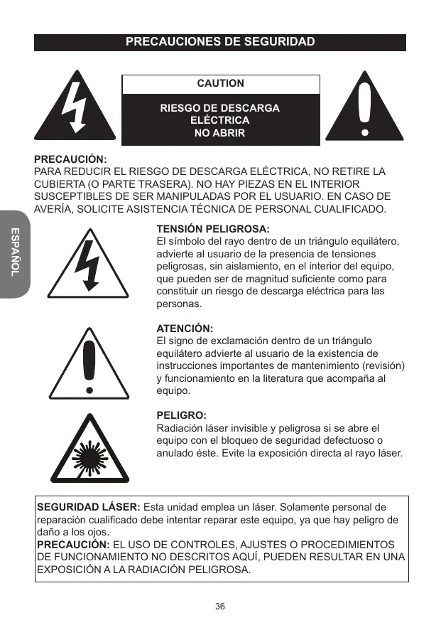 PRECAUCIONES DE SEGURIDAD CAUTION RIESGO DE DESCARGA ELÉCTRICA NO ABRIR PRECAUCIÓN: PARA REDUCIR EL RIESGO DE DESCARGA ELÉCTRICA, NO RETIRE LA CUBIERTA (O PARTE TRASERA). NO HAY PIEZAS EN EL INTERIOR SUSCEPTIBLES DE SER MANIPULADAS POR EL USUARIO. EN CASO DE AVERÍA, SOLICITE ASISTENCIA TÉCNICA DE PERSONAL CUALIFICADO.