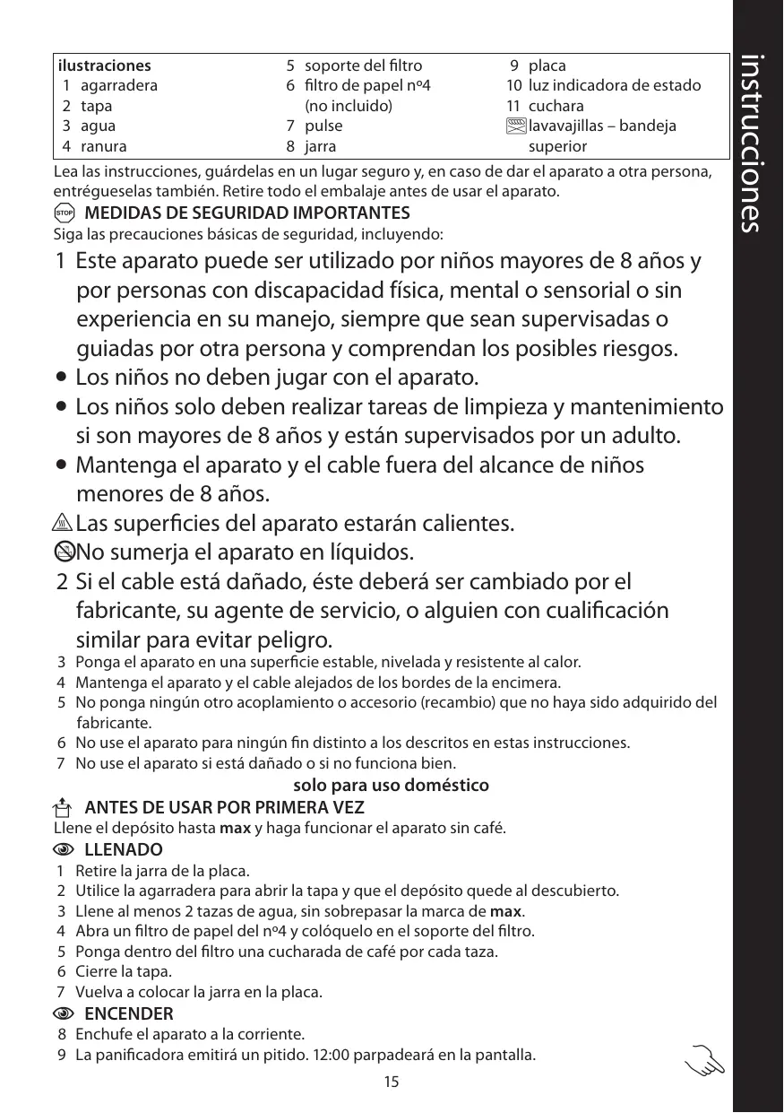 5 soporte del filtro 9 placa 1 agarradera 6 filtro de papel nº4 10 luz indicadora de estado 2 tapa (no incluido) 11 cuchara 3 agua 7 pulse ¬ lavavajillas – bandeja 4 ranura 8 jarra superior Lea las instrucciones, guárdelas en un lugar seguro y, en caso de dar el aparato a otra persona, entrégueselas también. Retire todo el embalaje antes de usar el aparato.