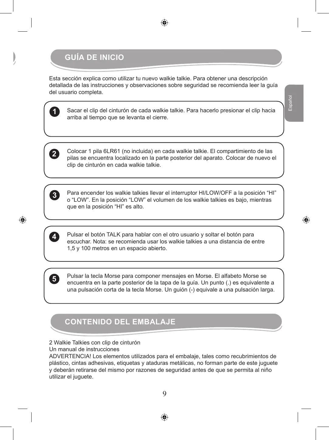 2 Walkie Talkies con clip de cinturón Un manual de instrucciones ADVERTENCIA! Los elementos utilizados para el embalaje, tales como recubrimientos de plástico, cintas adhesivas, etiquetas y ataduras metálicas, no forman parte de este juguete y deberán retirarse del mismo por razones de seguridad antes de que se permita al niño utilizar el juguete.