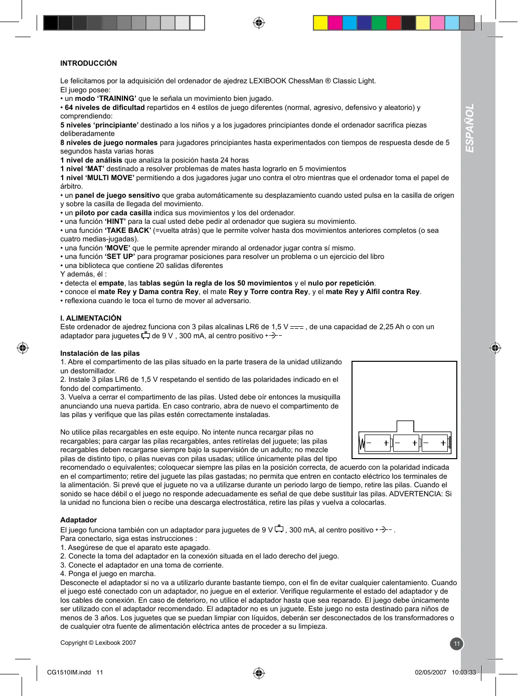 Le felicitamos por la adquisición del ordenador de ajedrez LEXIBOOK ChessMan ® Classic Light. El juego posee: • un modo ‘TRAINING’ que le señala un movimiento bien jugado. • 64 niveles de dificultad repartidos en 4 estilos de juego diferentes (normal, agresivo, defensivo y aleatorio) y comprendiendo: 5 niveles ‘principiante’ destinado a los niños y a los jugadores principiantes donde el ordenador sacrifica piezas deliberadamente 8 niveles de juego normales para jugadores principiantes hasta experimentados con tiempos de respuesta desde de 5 segundos hasta varias horas 1 nivel de análisis que analiza la posición hasta 24 horas 1 nivel ‘MAT’ destinado a resolver problemas de mates hasta lograrlo en 5 movimientos 1 nivel ‘MULTI MOVE’ permitiendo a dos jugadores jugar uno contra el otro mientras que el ordenador toma el papel de árbitro. • un panel de juego sensitivo que graba automáticamente su desplazamiento cuando usted pulsa en la casilla de origen y sobre la casilla de llegada del movimiento. • un piloto por cada casilla indica sus movimientos y los del ordenador. • una función ‘HINT’ para la cual usted debe pedir al ordenador que sugiera su movimiento. • una función ‘TAKE BACK’ (=vuelta atrás) que le permite volver hasta dos movimientos anteriores completos (o sea cuatro medias-jugadas). • una función ‘MOVE’ que le permite aprender mirando al ordenador jugar contra sí mismo. • una función ‘SET UP’ para programar posiciones para resolver un problema o un ejercicio del libro • una biblioteca que contiene 20 salidas diferentes Y además, él : • detecta el empate, las tablas según la regla de los 50 movimientos y el nulo por repetición. • conoce el mate Rey y Dama contra Rey, el mate Rey y Torre contra Rey, y el mate Rey y Alfil contra Rey. • reflexiona cuando le toca el turno de mover al adversario. I. ALIMENTACIÓN Este ordenador de ajedrez funciona con 3 pilas alcalinas LR6 de 1,5 V adaptador para juguetes de 9 V , 300 mA, al centro positivo