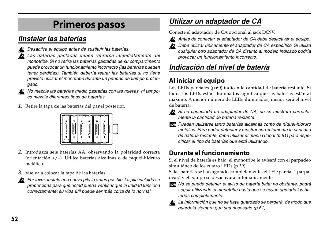 IInstalar las baterías Desactive el equipo antes de sustituir las baterías. Las baterías gastadas deben retirarse inmediatamente del monotribe. Si no retira las baterías gastadas de su compartimento puede provocar un funcionamiento incorrecto (las baterías pueden tener pérdidas). También debería retirar las baterías si no tiene previsto utilizar el monotribe durante un periodo de tiempo prolongado. No mezcle las baterías medio gastadas con las nuevas, ni tampoco mezcle diferentes tipos de baterías.