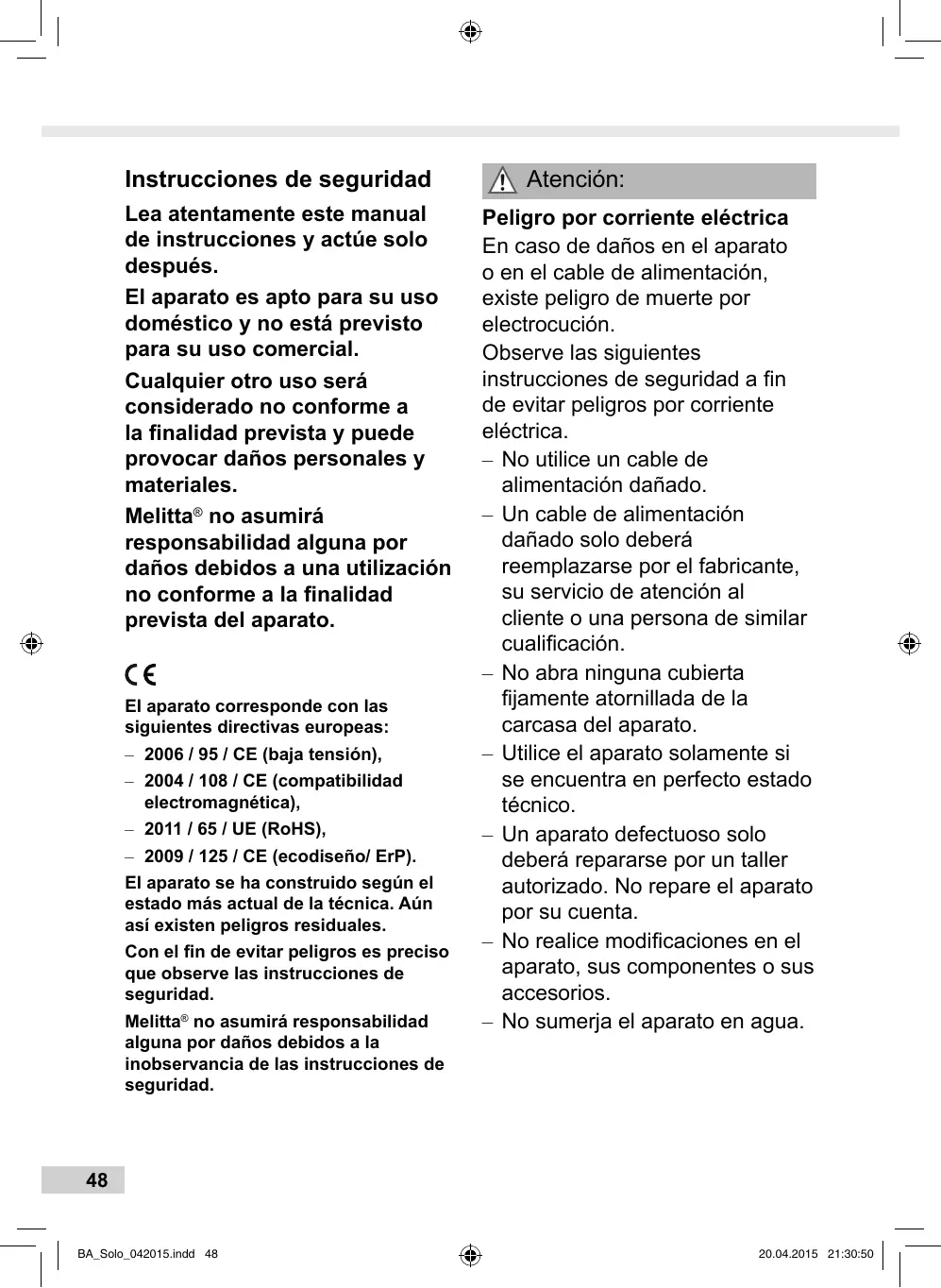Instrucciones de seguridad Lea atentamente este manual de instrucciones y actúe solo después. El aparato es apto para su uso doméstico y no está previsto para su uso comercial. Cualquier otro uso será considerado no conforme a la finalidad prevista y puede provocar daños personales y materiales. Melitta® no asumirá responsabilidad alguna por daños debidos a una utilización no conforme a la finalidad prevista del aparato. El aparato corresponde con las siguientes directivas europeas: – 2006 / 95 / CE (baja tensión), – 2004 / 108 / CE (compatibilidad electromagnética), – 2011 / 65 / UE (RoHS), – 2009 / 125 / CE (ecodiseño/ ErP). El aparato se ha construido según el estado más actual de la técnica. Aún así existen peligros residuales. Con el fin de evitar peligros es preciso que observe las instrucciones de seguridad. Melitta® no asumirá responsabilidad alguna por daños debidos a la inobservancia de las instrucciones de seguridad. Atención: Peligro por corriente eléctrica En caso de daños en el aparato o en el cable de alimentación, existe peligro de muerte por electrocución. Observe las siguientes instrucciones de seguridad a fin de evitar peligros por corriente eléctrica. – No utilice un cable de alimentación dañado. – Un cable de alimentación dañado solo deberá reemplazarse por el fabricante, su servicio de atención al cliente o una persona de similar cualificación. – No abra ninguna cubierta fijamente atornillada de la carcasa del aparato. – Utilice el aparato solamente si se encuentra en perfecto estado técnico. – Un aparato defectuoso solo deberá repararse por un taller autorizado. No repare el aparato por su cuenta. – No realice modificaciones en el aparato, sus componentes o sus accesorios. – No sumerja el aparato en agua.