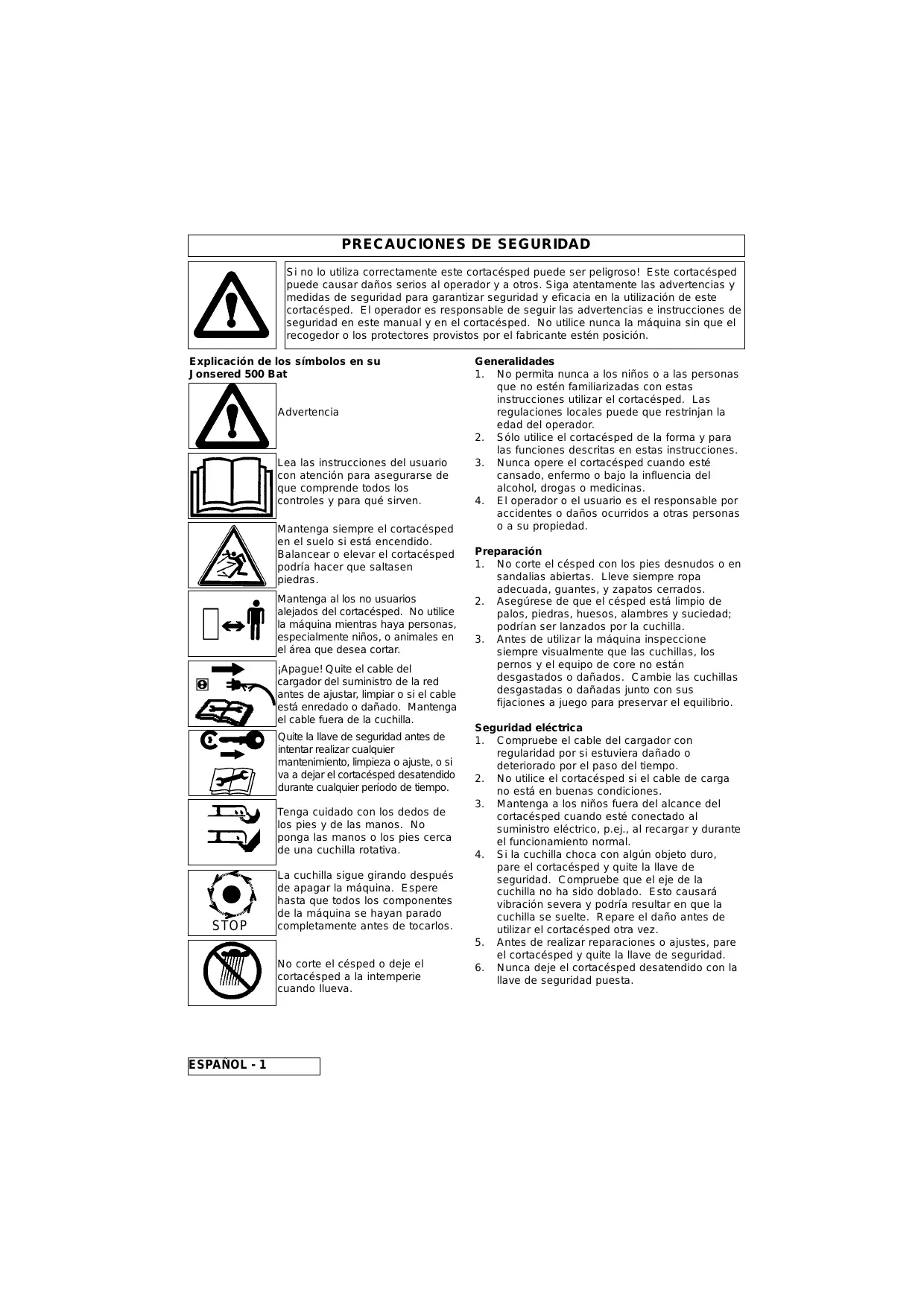 E Lea el manual del operador con atención y asegúrese de que comprende el contenido antes de utilizar el cortacésped.