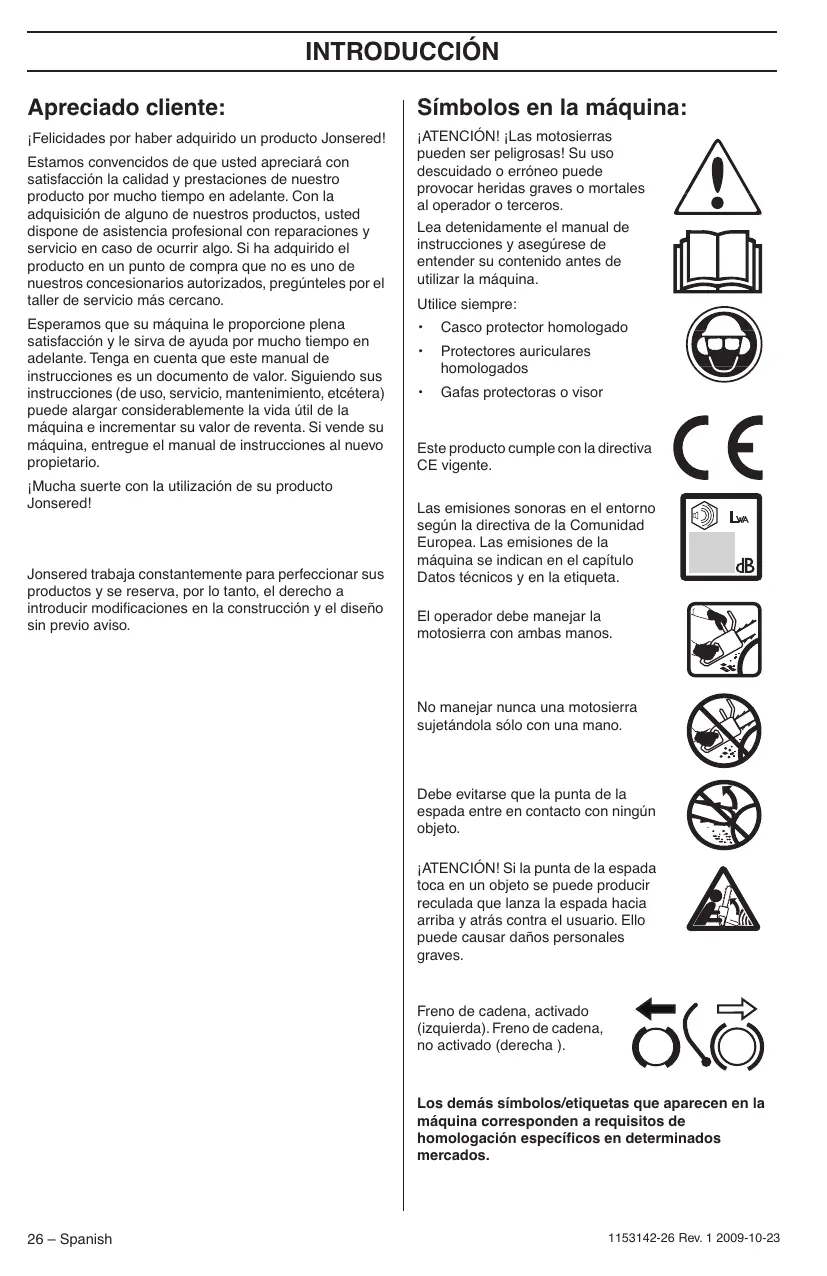 Esperamos que su máquina le proporcione plena satisfacción y le sirva de ayuda por mucho tiempo en adelante. Tenga en cuenta que este manual de instrucciones es un documento de valor. Siguiendo sus instrucciones (de uso, servicio, mantenimiento, etcétera) puede alargar considerablemente la vida útil de la máquina e incrementar su valor de reventa. Si vende su máquina, entregue el manual de instrucciones al nuevo propietario. ¡Mucha suerte con la utilización de su producto Jonsered!
