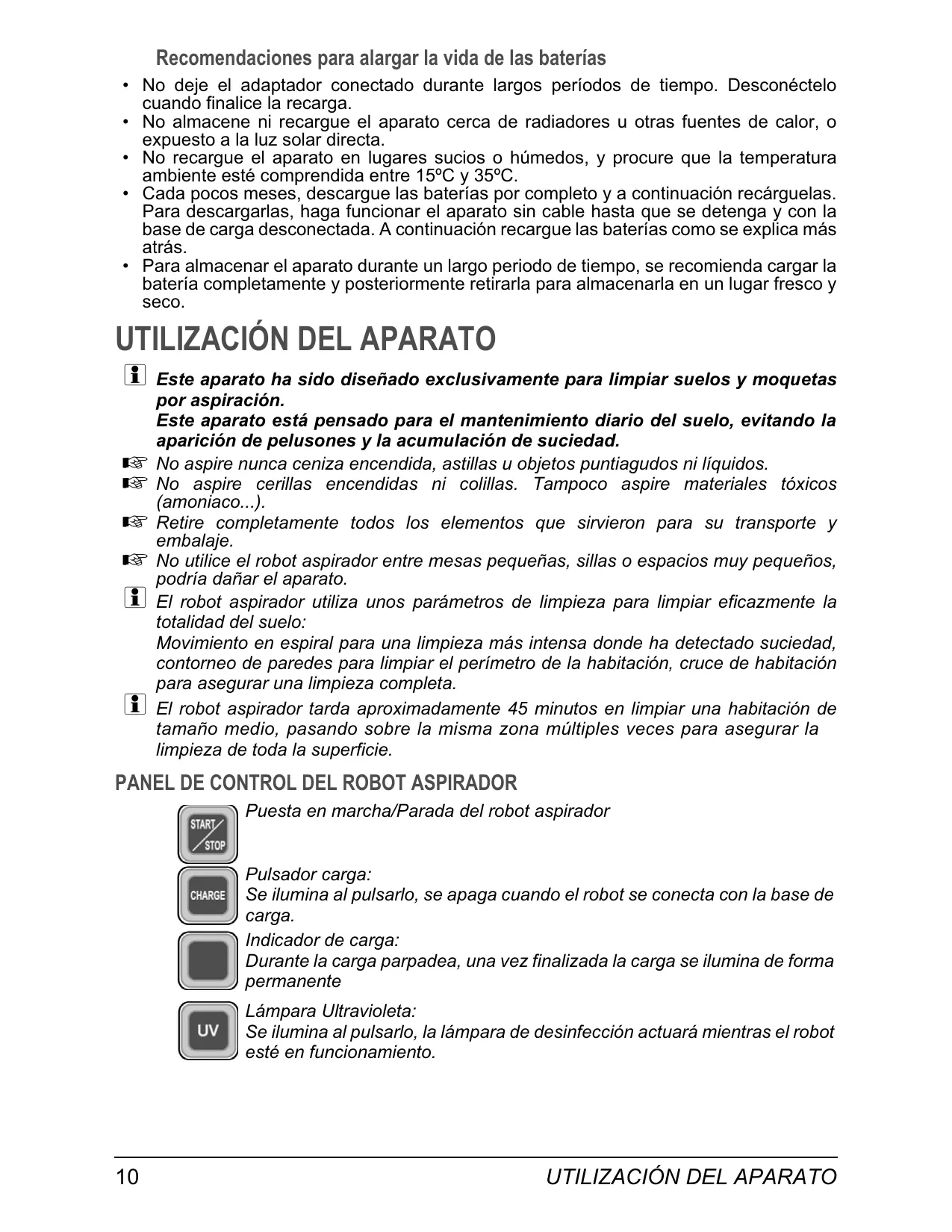 por aspiración. Este aparato está pensado para el mantenimiento diario del suelo, evitando la aparición de pelusones y la acumulación de suciedad. No aspire nunca ceniza encendida, astillas u objetos puntiagudos ni líquidos. No aspire cerillas encendidas ni colillas. Tampoco aspire materiales tóxicos (amoniaco...). Retire completamente todos los elementos que sirvieron para su transporte y embalaje. No utilice el robot aspirador entre mesas pequeñas, sillas o espacios muy pequeños, podría dañar el aparato. El robot aspirador utiliza unos parámetros de limpieza para limpiar eficazmente la totalidad del suelo: Movimiento en espiral para una limpieza más intensa donde ha detectado suciedad, contorneo de paredes para limpiar el perímetro de la habitación, cruce de habitación para asegurar una limpieza completa. El robot aspirador tarda aproximadamente 45 minutos en limpiar una habitación de tamaño medio, pasando sobre la misma zona múltiples veces para asegurar la limpieza de toda la superficie.