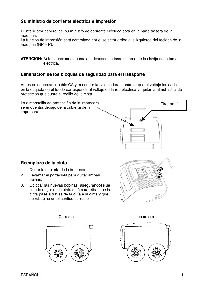 Datos presentes en la memoria Su ministro de corriente eléctrica e Impresión El interruptor general del su ministro de corriente eléctrica está en la parte trasera de la máquina. La función de impresión está controlada por el selector arriba a la izquierda del teclado de la máquina (NP – P). ATENCIÓN: Ante situaciones anómalas, desconecte inmediatamente la clavija de la toma eléctrica. Eliminación de los bloques de seguridad para el transporte Antes de conectar el cable CA y encender la calculadora, controlar que el voltaje indicado en la etiqueta en el fondo corresponda al voltaje de la red eléctrica y, quitar la almohadilla de protección que cubre el rodillo de la cinta. La almohadilla de protección de la impresora se encuentra debajo de la cubierta de la impresora. Tirar aquí Reemplazo de la cinta