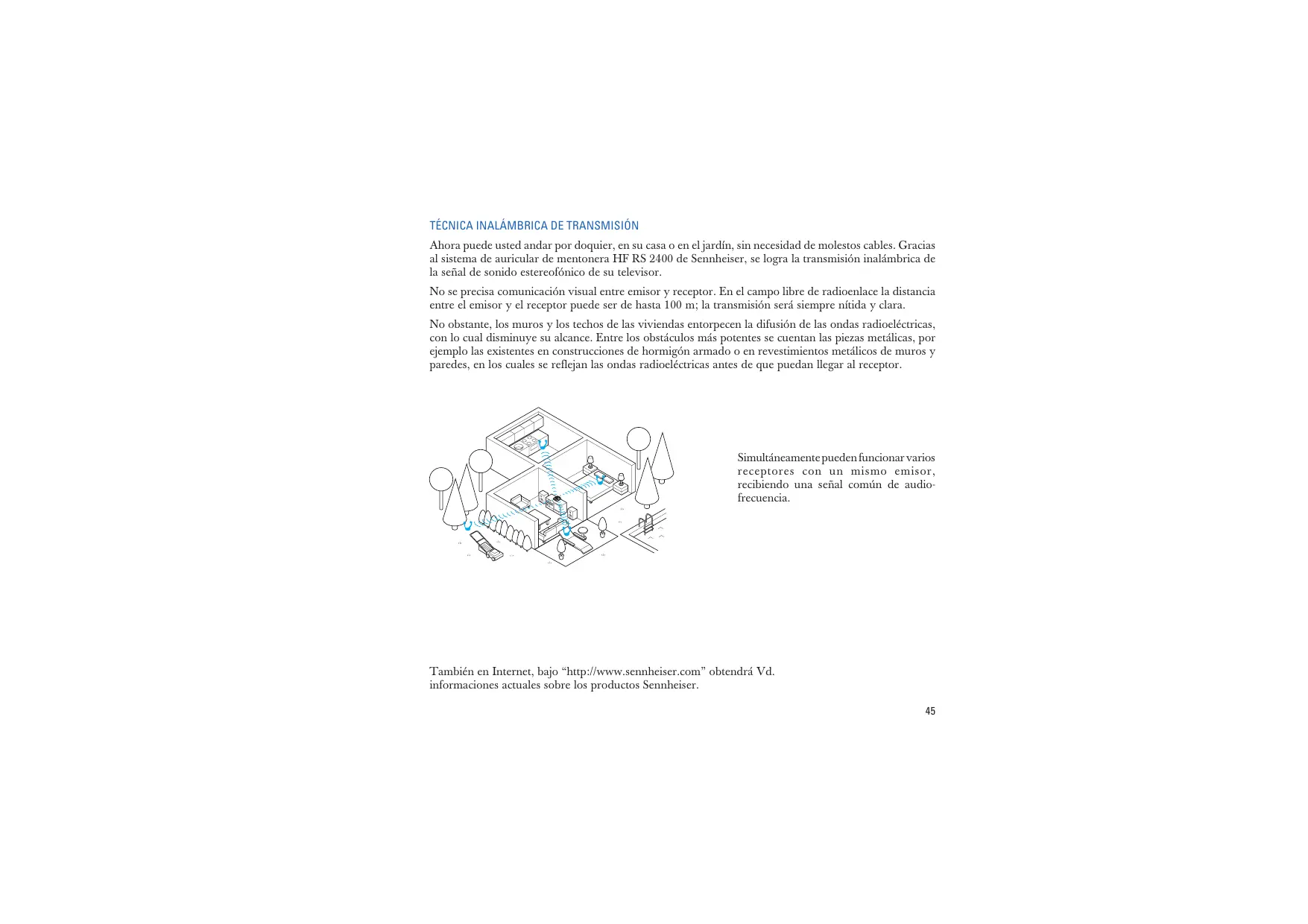 TÉCNICA INALÁMBRICA DE TRANSMISIÓN Ahora puede usted andar por doquier, en su casa o en el jardín, sin necesidad de molestos cables. Gracias al sistema de auricular de mentonera HF RS 2400 de Sennheiser, se logra la transmisión inalámbrica de la señal de sonido estereofónico de su televisor. No se precisa comunicación visual entre emisor y receptor. En el campo libre de radioenlace la distancia entre el emisor y el receptor puede ser de hasta 100 m; la transmisión será siempre nítida y clara. No obstante, los muros y los techos de las viviendas entorpecen la difusión de las ondas radioeléctricas, con lo cual disminuye su alcance. Entre los obstáculos más potentes se cuentan las piezas metálicas, por ejemplo las existentes en construcciones de hormigón armado o en revestimientos metálicos de muros y paredes, en los cuales se reflejan las ondas radioeléctricas antes de que puedan llegar al receptor. Simultáneamente pueden funcionar varios receptores con un mismo emisor, recibiendo una señal común de audiofrecuencia. También en Internet, bajo “http://www.sennheiser.com” obtendrá Vd. informaciones actuales sobre los productos Sennheiser.