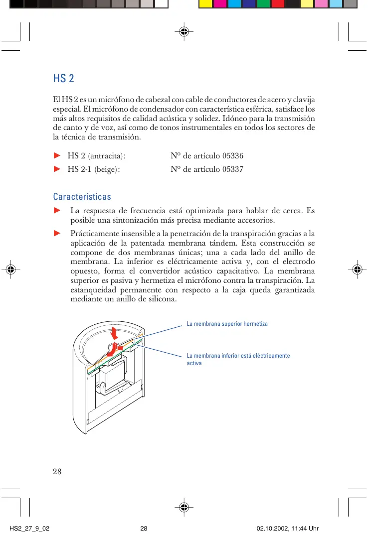 El HS 2 es un microfono de cabeza con cable de conductores de acero y clavija especial. El microfono de condensador con caracteristica esferica, satisface los más altoos requisitos de calidad acústica y solidez. Idóneo para la transmisión de canto y de voz, asi como de tonos instrumentales en todos los sectores de la技术和 de transmisión.