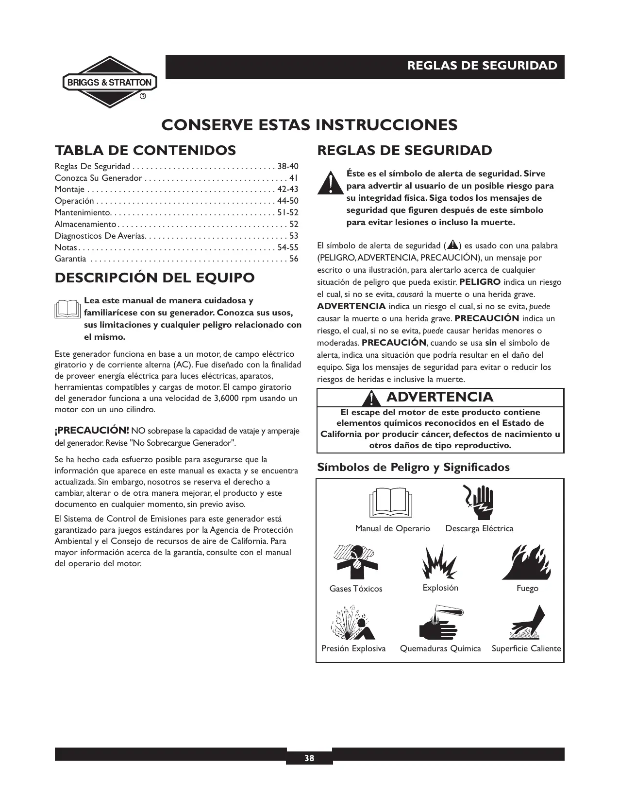 Lea este manual de manera cuidadosa y familiarícese con su generador. Conozca sus usos, sus limitaciones y cualquier peligro relacionado con el mismo. Este generador funciona en base a un motor, de campo eléctrico giratorio y de corriente alterna (AC). Fue diseñado con la finalidad de proveer energía eléctrica para luces eléctricas, aparatos, herramientas compatibles y cargas de motor. El campo giratorio del generador funciona a una velocidad de 3,6000 rpm usando un motor con un uno cilindro. ADVERTENCIA El escape del motor de este producto contiene elementos químicos reconocidos en el Estado de California por producir cáncer, defectos de nacimiento u otros daños de tipo reproductivo. ¡PRECAUCIÓN! NO sobrepase la capacidad de vataje y amperaje del generador. Revise "No Sobrecargue Generador". Se ha hecho cada esfuerzo posible para asegurarse que la información que aparece en este manual es exacta y se encuentra actualizada. Sin embargo, nosotros se reserva el derecho a cambiar, alterar o de otra manera mejorar, el producto y este documento en cualquier momento, sin previo aviso. Símbolos de Peligro y Significados El Sistema de Control de Emisiones para este generador está garantizado para juegos estándares por la Agencia de Protección Ambiental y el Consejo de recursos de aire de California. Para mayor información acerca de la garantía, consulte con el manual del operario del motor. Manual de Operario