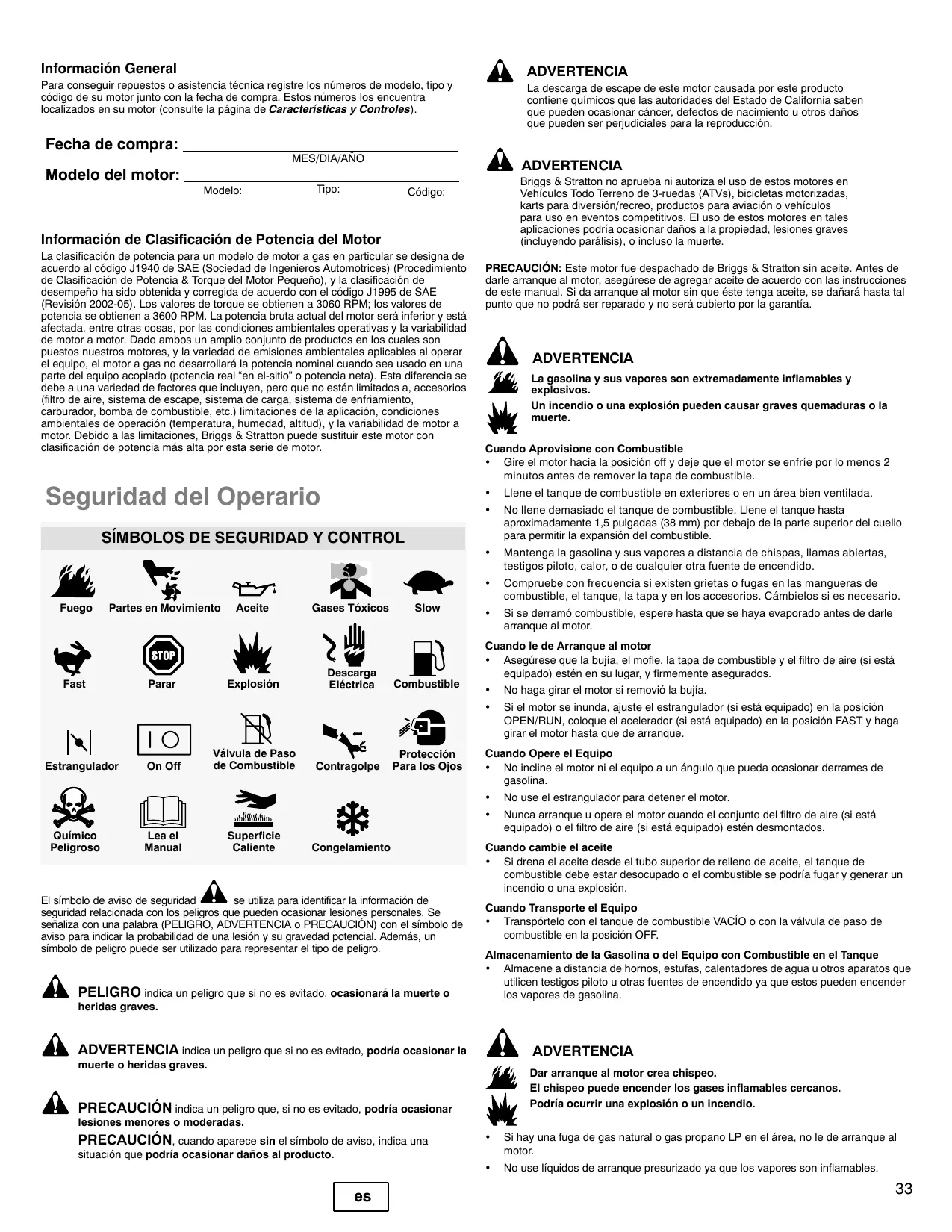 Modelo del motor: Modelo: Tipo: Cédigo: Informaciôn de Clasificacién de Potencia del Motor La clasificaciôn de potencia para un modelo de motor a gas en particular se designa de acuerdo al cédigo J1940 de SAE (Sociedad de Ingenieros Automotrices) (Prcedimiento de Clasificaciôn de Potencia & Torque del Motor Pequeño), y la clasificaciôn de desempeño ha sido obtenida y corregida de acuerdo con el cédigo J1995 de SAE {Revisiôn 2002-05). Los valores de torque se obtienen a 3060 RPM: los valores de potencia se obtienen a 3600 RPM. La potencia bruta actual del motor ser inferior y estä afectada, entre otras cosas, por las condiciones ambientales operativas y la variabilidad de motor a motor, Dado ambos un amplio conjunto de productos en los cuales son puestos nuestros motores, y la variedad de emisiones ambientales aplicables al operar el equipo, el motor a gas no desarrollarä la potencia nominal cuando sea usado en una parte del equipo acoplado (potencia real ‘en el-sitio” o potencia neta). Esta diferencia se debe a una variedad de factores que incluyen, pero que no estän limitados a, accesorios (fitro de aire, sistema de escape, sistema de carga, sistema de enfriamiento, carburador, bomba de combustible, etc.) limitaciones de la aplicacién, condiciones ambientales de operaciôn (temperatura, humedad, altitud), y la variabilidad de motor a motor. Debido a las limitaciones, Briggs & Stratton puede sustituir este motor con clasificaciôn de potencia mäs alta por esta serie de motor. Seguridad del Operario SiMBOLOS DE SEGURIDAD Y CONTROL er À Fuego Partes en Movimiento Aceite Gases Téxicos Slow Descarga Fast Parar Explosiôn Eléctrica Combustible NI 1O N a. Välvula de Paso Y Protecciôn On off de Combustible