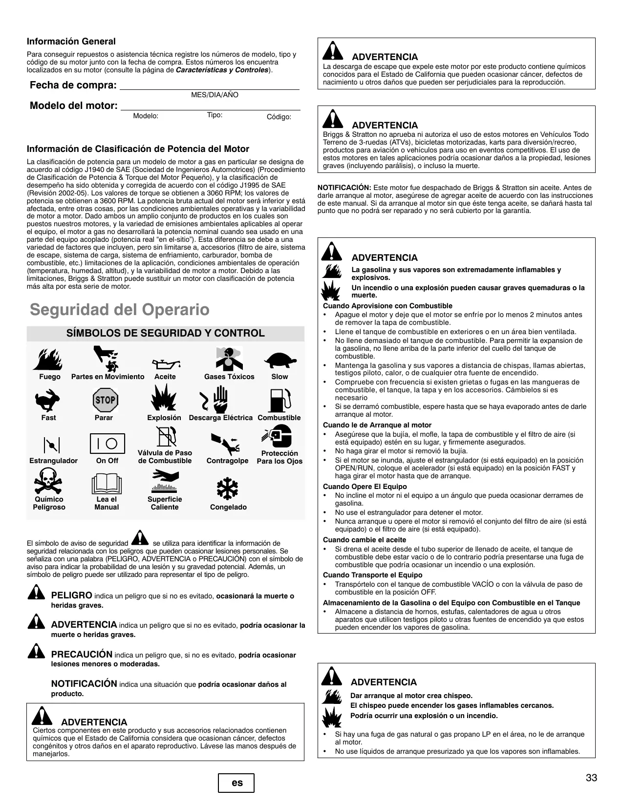 Tipo: Modelo: Código: Información de Clasificación de Potencia del Motor La clasificación de potencia para un modelo de motor a gas en particular se designa de acuerdo al código J1940 de SAE (Sociedad de Ingenieros Automotrices) (Procedimiento de Clasificación de Potencia & Torque del Motor Pequeño), y la clasificación de desempeño ha sido obtenida y corregida de acuerdo con el código J1995 de SAE (Revisión 2002-05). Los valores de torque se obtienen a 3060 RPM; los valores de potencia se obtienen a 3600 RPM. La potencia bruta actual del motor será inferior y está afectada, entre otras cosas, por las condiciones ambientales operativas y la variabilidad de motor a motor. Dado ambos un amplio conjunto de productos en los cuales son puestos nuestros motores, y la variedad de emisiones ambientales aplicables al operar el equipo, el motor a gas no desarrollará la potencia nominal cuando sea usado en una parte del equipo acoplado (potencia real “en el-sitio”). Esta diferencia se debe a una variedad de factores que incluyen, pero sin limitarse a, accesorios (filtro de aire, sistema de escape, sistema de carga, sistema de enfriamiento, carburador, bomba de combustible, etc.) limitaciones de la aplicación, condiciones ambientales de operación (temperatura, humedad, altitud), y la variabilidad de motor a motor. Debido a las limitaciones, Briggs & Stratton puede sustituir un motor con clasificación de potencia más alta por esta serie de motor. Seguridad del Operario
