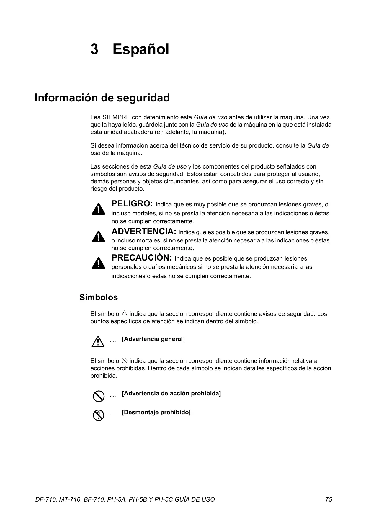 3 Español Información de seguridad Lea SIEMPRE con detenimiento esta Guía de uso antes de utilizar la máquina. Una vez que la haya leído, guárdela junto con la Guía de uso de la máquina en la que está instalada esta unidad acabadora (en adelante, la máquina). Si desea información acerca del técnico de servicio de su producto, consulte la Guía de uso de la máquina. Las secciones de esta Guía de uso y los componentes del producto señalados con símbolos son avisos de seguridad. Estos están concebidos para proteger al usuario, demás personas y objetos circundantes, así como para asegurar el uso correcto y sin riesgo del producto. PELIGRO: Indica que es muy posible que se produzcan lesiones graves, o incluso mortales, si no se presta la atención necesaria a las indicaciones o éstas no se cumplen correctamente. ADVERTENCIA: Indica que es posible que se produzcan lesiones graves, o incluso mortales, si no se presta la atención necesaria a las indicaciones o éstas no se cumplen correctamente. PRECAUCIÓN: Indica que es posible que se produzcan lesiones personales o daños mecánicos si no se presta la atención necesaria a las indicaciones o éstas no se cumplen correctamente. Símbolos El símbolo indica que la sección correspondiente contiene avisos de seguridad. Los puntos específicos de atención se indican dentro del símbolo.