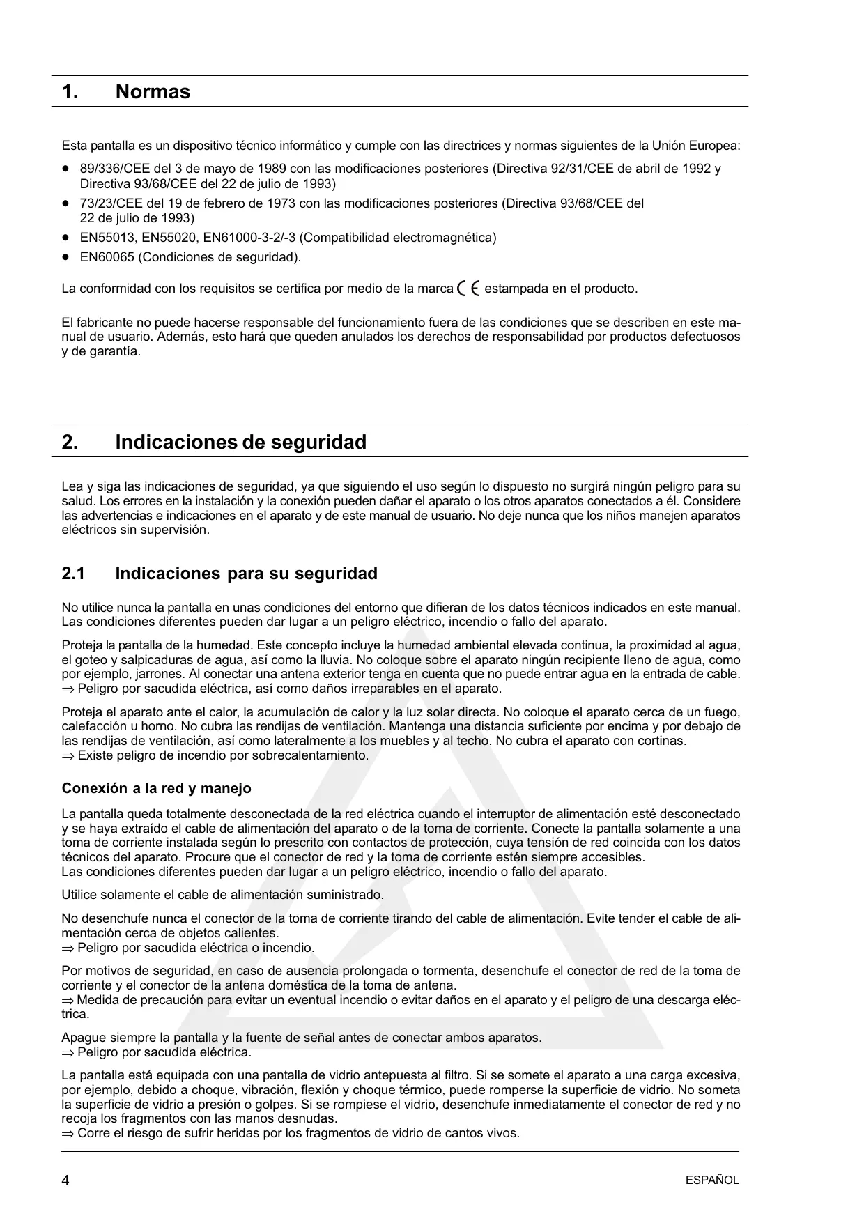 Normas Esta pantalla es un dispositivo técnico informático y cumple con las directrices y normas siguientes de la Unión Europea: 89/336/CEE del 3 de mayo de 1989 con las modificaciones posteriores (Directiva 92/31/CEE de abril de 1992 y Directiva 93/68/CEE del 22 de julio de 1993) 73/23/CEE del 19 de febrero de 1973 con las modificaciones posteriores (Directiva 93/68/CEE del 22 de julio de 1993) EN55013, EN55020, EN61000-3-2/-3 (Compatibilidad electromagnética) EN60065 (Condiciones de seguridad). La conformidad con los requisitos se certifica por medio de la marca estampada en el producto. El fabricante no puede hacerse responsable del funcionamiento fuera de las condiciones que se describen en este maĆ nual de usuario. Además, esto hará que queden anulados los derechos de responsabilidad por productos defectuosos y de garantía.