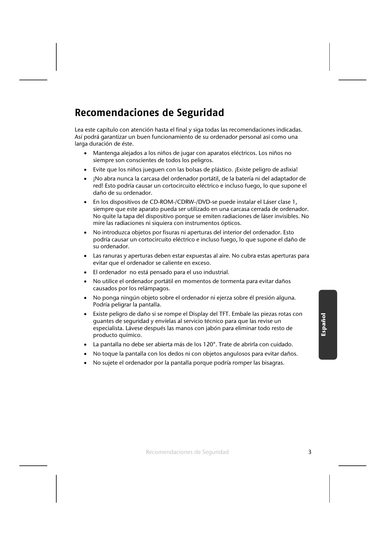 Español Recomendaciones de Seguridad Lea este capítulo con atención hasta el final y siga todas las recomendaciones indicadas. Así podrá garantizar un buen funcionamiento de su ordenador personal así como una larga duración de éste. Mantenga alejados a los niños de jugar con aparatos eléctricos. Los niños no siempre son conscientes de todos los peligros.