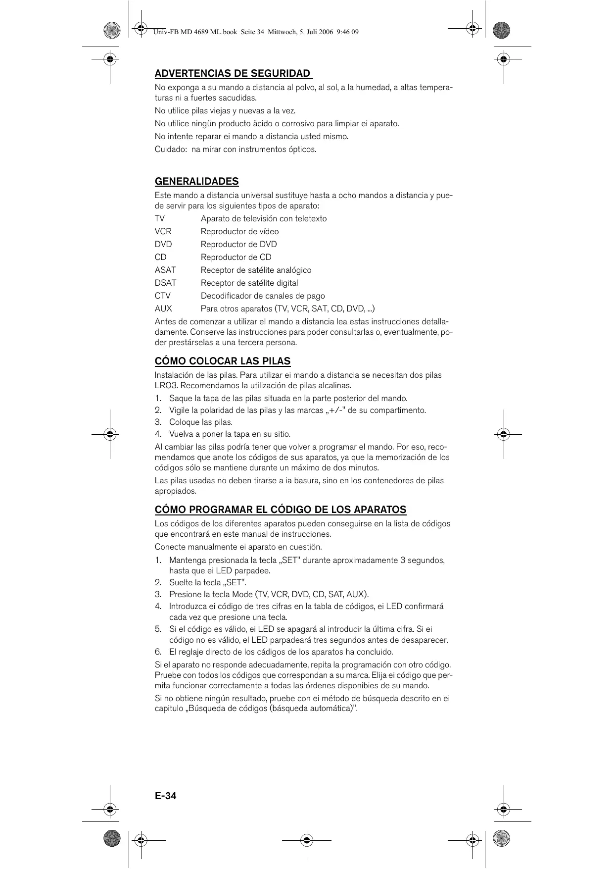 INDICE FUNCiones . . . . . . . . . . . . . . . . . . . . . . . . . . . . . . . . . . . . . . . . . . . . . . . . . . . . 33 ADVERTENCIAS DE SEGURIDAD . . . . . . . . . . . . . . . . . . . . . . . . . . . . . 34 GENERALIDADES . . . . . . . . . . . . . . . . . . . . . . . . . . . . . . . . . . . . . . . . . . . . . 34 CÓMO COLOCAR LAS PILAS . . . . . . . . . . . . . . . . . . . . . . . . . . . . . . . . . . . 34 CÓMO PROGRAMAR EL CÓDIGO DE LOS APARATOS . . . . . . . . 34 BUSQUEDA DE CÓDIGOS (BUSQUEDA MANUAL) . . . . . . . . . . . . 35 BUSQUEDA DE CÓDIGOS (BUSQUEDA AUTOMÁTICA) . . . . . . . . 35 BUSQUEDA DE CÓDIGOS SEGÚN LA MARCA . . . . . . . . . . . . . . . . 35 IDENTIFICACIÓN DE CODIGOS . . . . . . . . . . . . . . . . . . . . . . . . . . . . . . . . 36 FUNCION DE APRENDIZAJE. . . . . . . . . . . . . . . . . . . . . . . . . . . . . . . . . . . 36 FUNCIÓN DE APRENDIZAJE. . . . . . . . . . . . . . . . . . . . . . . . . . . . . . . . . . . 36 FUNCIÓN ALL OFF . . . . . . . . . . . . . . . . . . . . . . . . . . . . . . . . . . . . . . . . . . . . 37 FUNCION TOGGLE . . . . . . . . . . . . . . . . . . . . . . . . . . . . . . . . . . . . . . . . . . . . 37 AUTOZAPPING . . . . . . . . . . . . . . . . . . . . . . . . . . . . . . . . . . . . . . . . . . . . . . . . 37 FUNCIONAMIENTO NORMAL . . . . . . . . . . . . . . . . . . . . . . . . . . . . . . . . . 37 FUNCION UNIVERSAL . . . . . . . . . . . . . . . . . . . . . . . . . . . . . . . . . . . . . . . . . . 38 FUNCIÓN SHIFT . . . . . . . . . . . . . . . . . . . . . . . . . . . . . . . . . . . . . . . . . . . . . . . 38 POSIBLES FALLOS . . . . . . . . . . . . . . . . . . . . . . . . . . . . . . . . . . . . . . . . . . . . 38