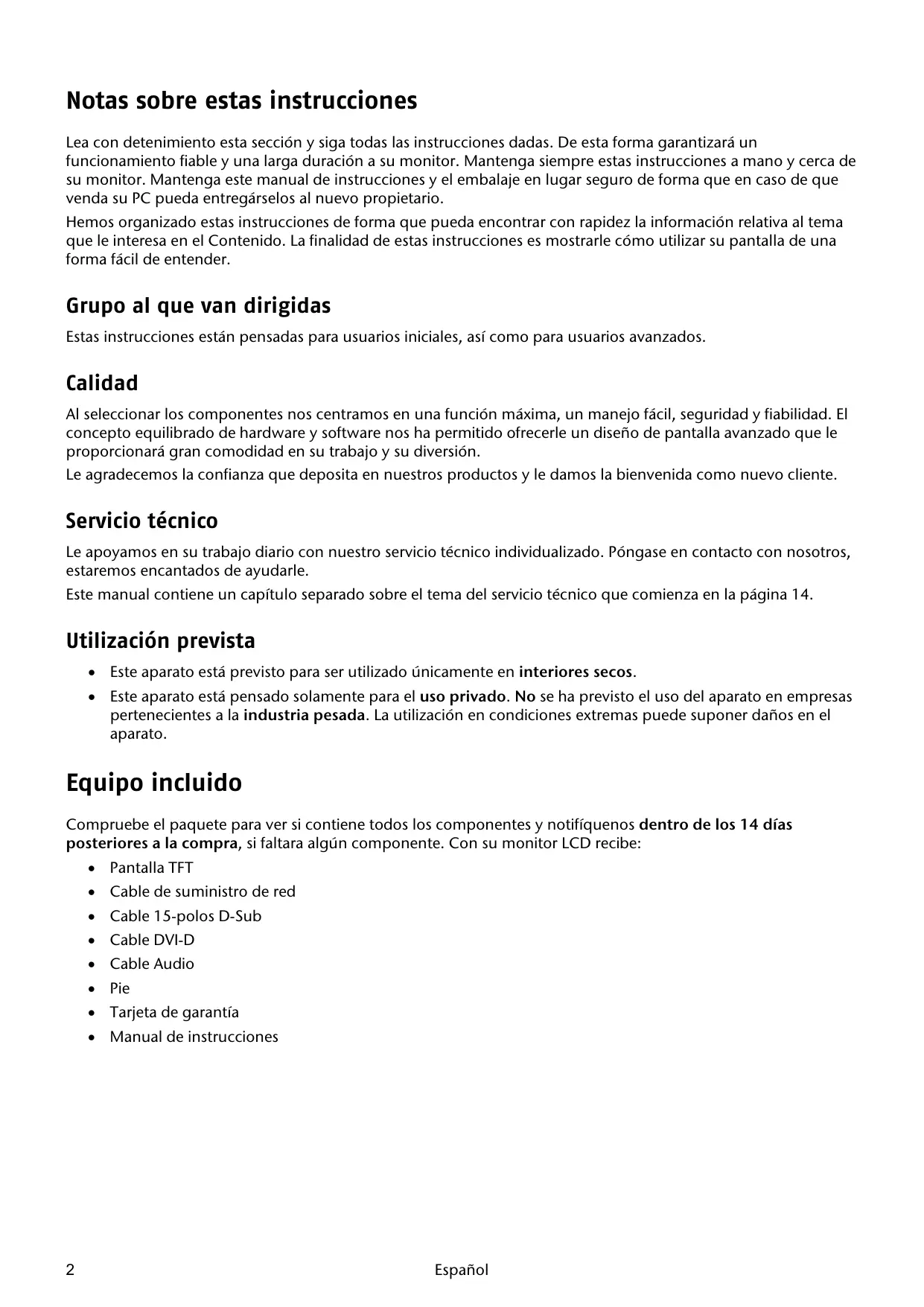 Equipo incluido Compruebe el paquete para ver si contiene todos los componentes y notifíquenos dentro de los 14 días posteriores a la compra, si faltara algún componente. Con su monitor LCD recibe: Pantalla TFT Cable de suministro de red Cable 15-polos D-Sub Cable DVI-D Cable Audio Pie Tarjeta de garantía Manual de instrucciones