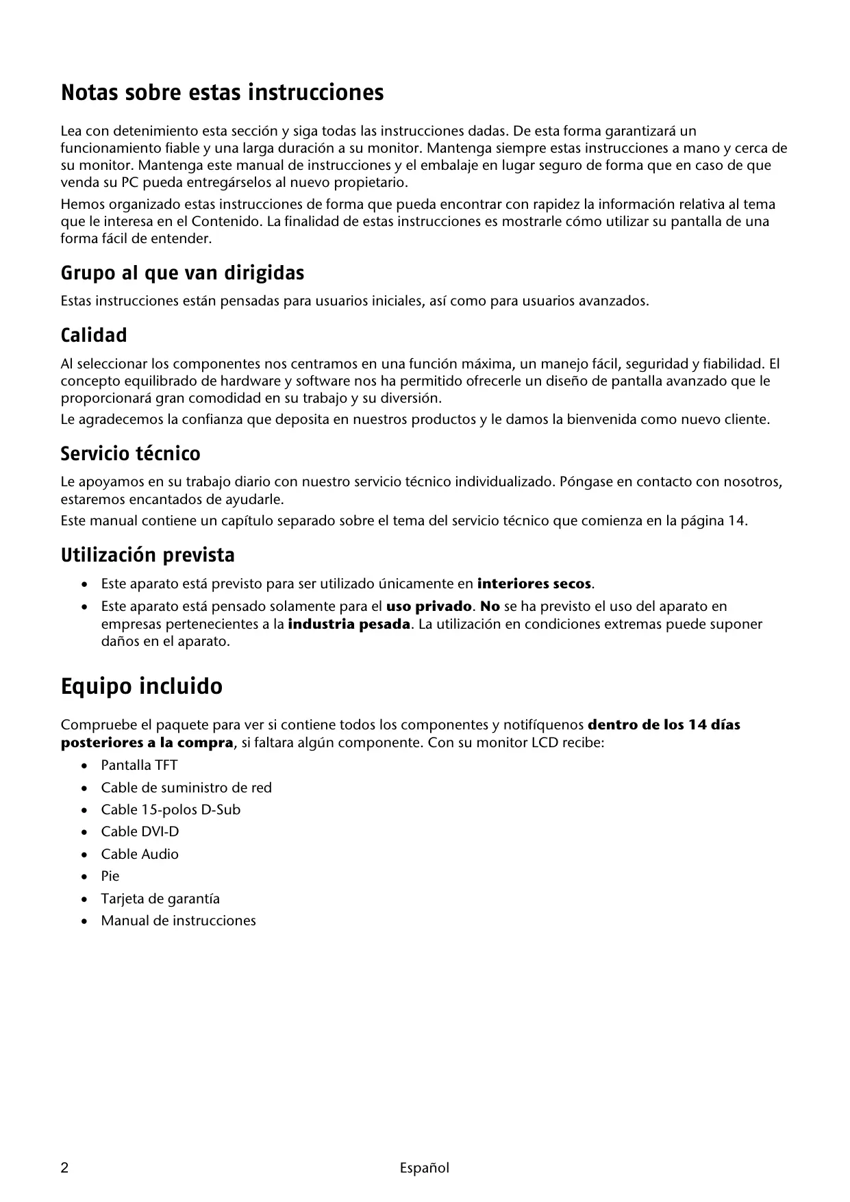 Equipo incluido Compruebe el paquete para ver si contiene todos los componentes y notifíquenos dentro de los 14 días posteriores a la compra, si faltara algún componente. Con su monitor LCD recibe: Pantalla TFT Cable de suministro de red Cable 15-polos D-Sub Cable DVI-D Cable Audio Pie Tarjeta de garantía Manual de instrucciones