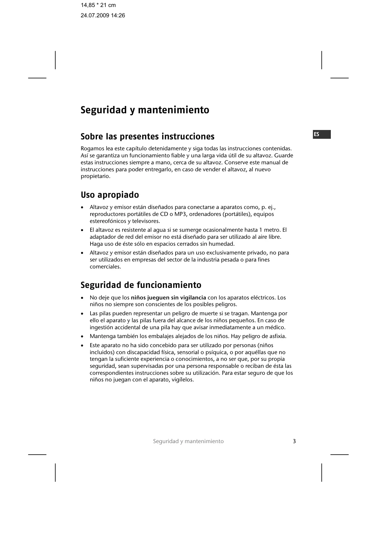 Para evaporar riesgos, no abra nunca la carcasa del altovoz, del emisor o del adaptorador de red! Cuando la carcasa del adaptorador de red está abierta existe riesgo mortal por possible descarga electrica. No contiene piezas que requieran mantenimiento.