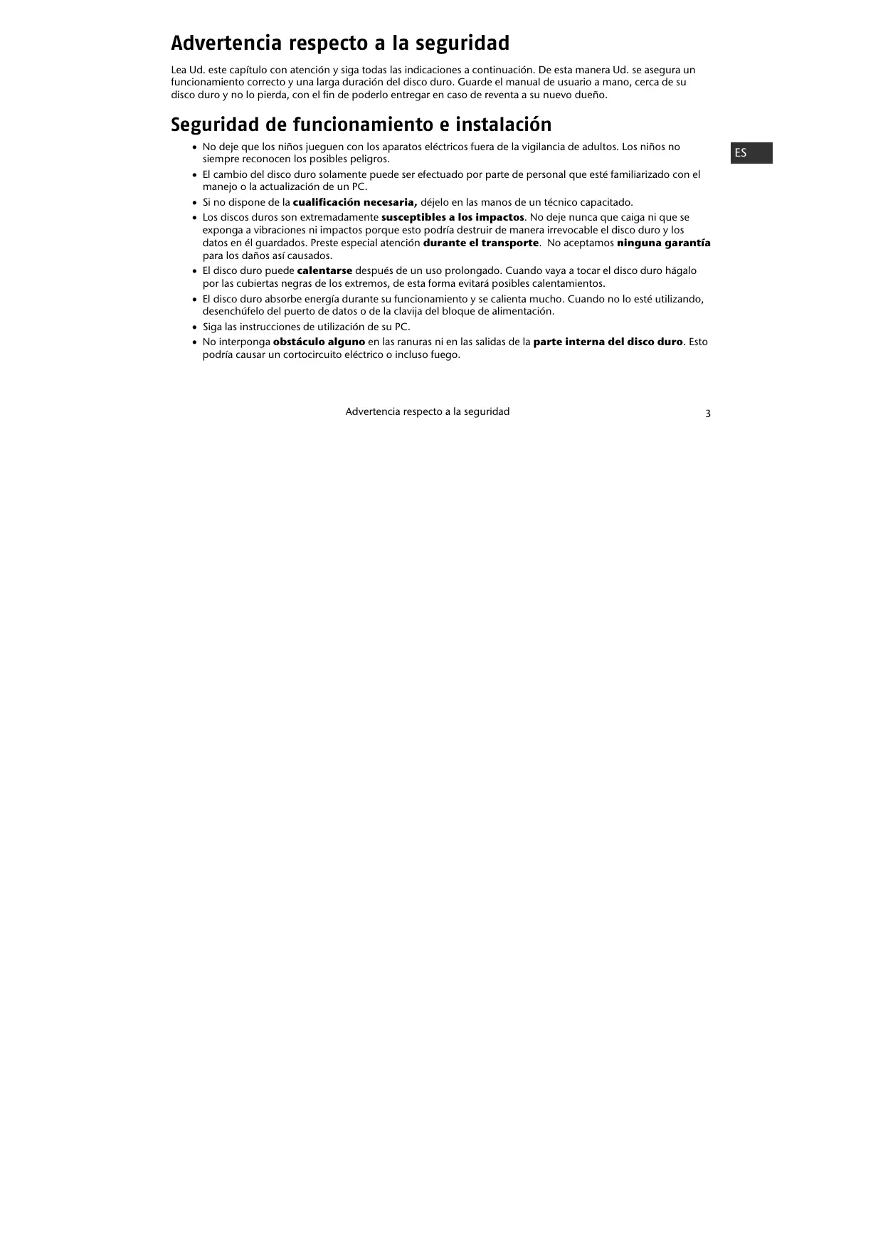 FR Lea Ud. este capítulo con atención y siga todas las indicaciones a continuación. De esta manera Ud. se asegura un funcionamiento correcto y una larga duración del disco duro. Guarde el manual de usuario a mano, cerca de su disco duro y no lo pierda, con el fin de poderlo entregar en caso de reventa a su nuevo dueño.