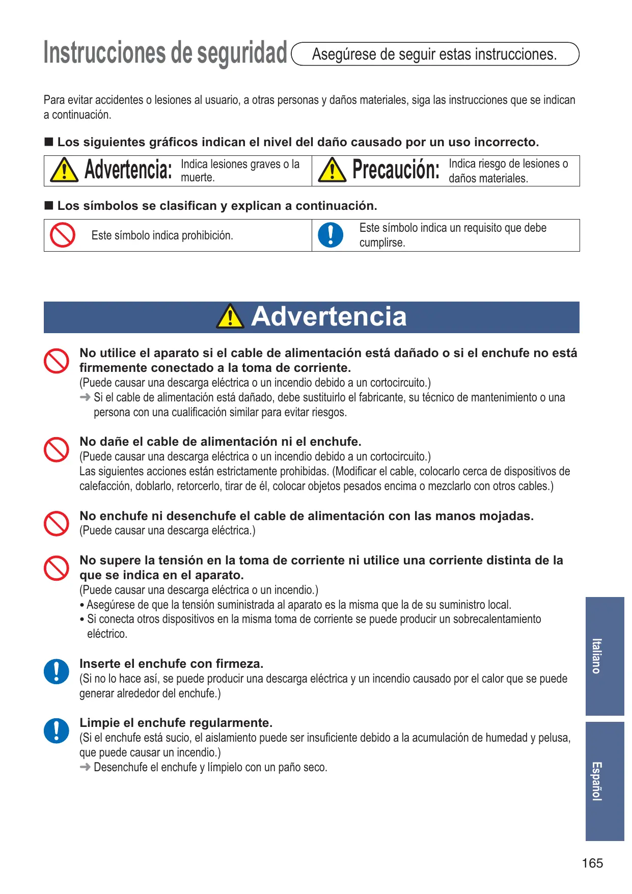 Instrucciones de seguridad Asegúrese de seguir estas instrucciones. Advertencia Interrumpa el uso del aparato de inmediato y desenchúfelo en el caso improbable de que deje de funcionar correctamente. (Puede producirse humo, un incendio, una descarga eléctrica o quemaduras.) por ejemplo, en caso de funcionamiento inusual o avería ● El enchufe y el cable de alimentación están inusualmente calientes. ● El cable de alimentación está dañado o hay un corte del suministro eléctrico. ● El cuerpo principal está deformado o inusualmente caliente. ● El aparato hace un ruido inusual al girar durante el uso. Desenchufe el aparato inmediatamente y póngase en contacto con el vendedor o con un servicio técnico de Panasonic para una revisión o reparación. No toque, bloquee ni cubra los orificios de salida de vapor de agua durante el uso. (Puede causar una quemadura.) ● Preste una atención especial a los niños. No desmonte, repare ni modifique este aparato. (Puede producirse un incendio, una descarga eléctrica o lesiones.) Póngase en contacto con el vendedor o con un servicio técnico de Panasonic. No sumerja el aparato en agua ni lo salpique con agua. (Puede causar una descarga eléctrica o un incendio debido a un cortocircuito.) Este aparato no se ha diseñado para que lo utilicen personas (incluidos los niños) con capacidad física, sensorial o mental reducida o carezcan de la experiencia y los conocimientos necesarios, a menos que hayan recibido instrucción sobre el uso del aparato o estén bajo la supervisión de una persona responsable de su seguridad. Los niños deben estar bajo supervisión para impedir que jueguen con el aparato. (Puede causar quemaduras, lesiones o una descarga eléctrica.) Precaución Asegúrese de sujetar el enchufe cuando lo desconecte de la red. (Si no lo hace así, puede causar una descarga eléctrica o un incendio debido a un cortocircuito.) Desconecte el enchufe cuando no esté utilizando el aparato. (Si no lo hace así, puede causar una descarga eléctrica o un incendio debido a fugas eléctricas.) Desenchufe el aparato y espere a que se enfríe antes de limpiarlo. (Puede causar una quemadura.) No permita que el cable de alimentación cuelgue del borde de la mesa ni esté en contacto con una superficie caliente. (Puede causar una quemadura o lesiones.) No extraiga el recipiente del pan ni desenchufe la máquina panificadora durante el uso. (Puede causar una quemadura o lesiones.)