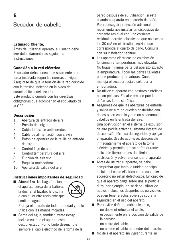 - Los aparatos electricos de calefaction funcionalan a temperatas muy elevadas. No toque ninguna parte del aparato excepto la empuñadura. Tocar las partes calientes能把 producir quemaduras. Cuando maneja el secador, cójalo solo por la empuñadura.