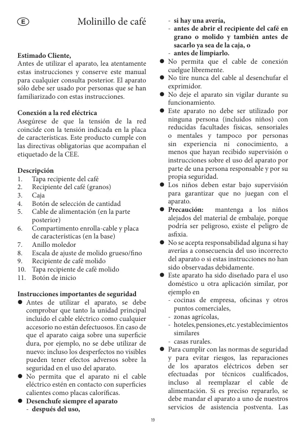 © Molinillo de café Estimado Cliente, Antes de utilizar el aparato, lea atentamente estas instrucciones y conserve este manual para cualquier consulta posterior. El aparato sélo debe ser usado por personas que se han familiarizado con estas instrucciones. Conexién a la red eléctrica Asegürese de que la tensién de la red coincide con la tensién indicada en la placa de caracterfsticas. Este producto cumple con las directivas obligatorias que acompañan el etiquetado de la CEE. Descripciôn