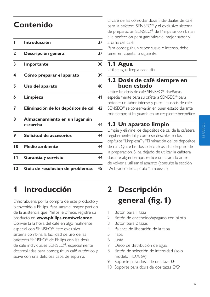 buen estado Utilice las dosis de café SENSEO® diseñadas especialmente para su cafetera SENSEO® para obtener un sabor intenso y puro. Las dosis de café SENSEO® se conservarán en buen estado durante más tiempo si las guarda en un recipiente hermético. Limpie y elimine los depósitos de cal de la cafetera regularmente tal y como se describe en los capítulos “Limpieza” y “Eliminación de los depósitos de cal”. Quite las dosis de café usadas después de la preparación. Si ha dejado de utilizar la cafetera durante algún tiempo, realice un aclarado antes de volver a utilizar el aparato (consulte la sección “Aclarado” del capítulo “Limpieza”). Botón para 1 taza Botón de encendido/apagado con piloto Botón para 2 tazas Palanca de liberación de la tapa Tapa Junta Disco de distribución de agua Botón de selección de intensidad (solo modelo HD7864) 9 Soporte para dosis de una taza q 10 Soporte para dosis de dos tazas qq