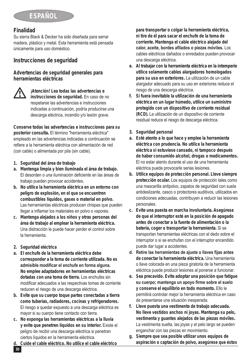 ESPAÑOL Finalidad Su sierra Black & Decker ha sido diseñada para serrar madera, plástico y metal. Esta herramienta está pensada únicamente para uso doméstico. Instrucciones de seguridad Advertencias de seguridad generales para herramientas eléctricas