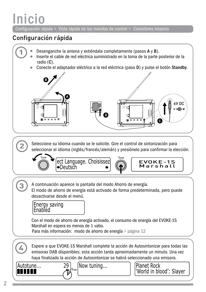 Seleccione su idioma cuando se le solicite. Gire el control de sintonización para seleccionar el idioma (inglés/francés/alemán) y presiónelo para confirmar la elección. Tune A continuación aparece la pantalla del modo Ahorro de energía. El modo de ahorro de energía está activado de forma predeterminada, pero puede desactivarse desde el menú. Energy saving Enabled Con el modo de ahorro de energía activado, el consumo de energía del EVOKE-1S Marshall en espera es menos de 1 vatio. Para más información: modo de ahorro de energía > página 12 Espere a que EVOKE-1S Marshall complete la acción de Autosintonizar para todas las emisoras DAB disponibles; esta acción tarda aproximadamente un minuto. Una vez haya finalizado la acción de Autosintonizar se habrá seleccionado una emisora. Autotune...