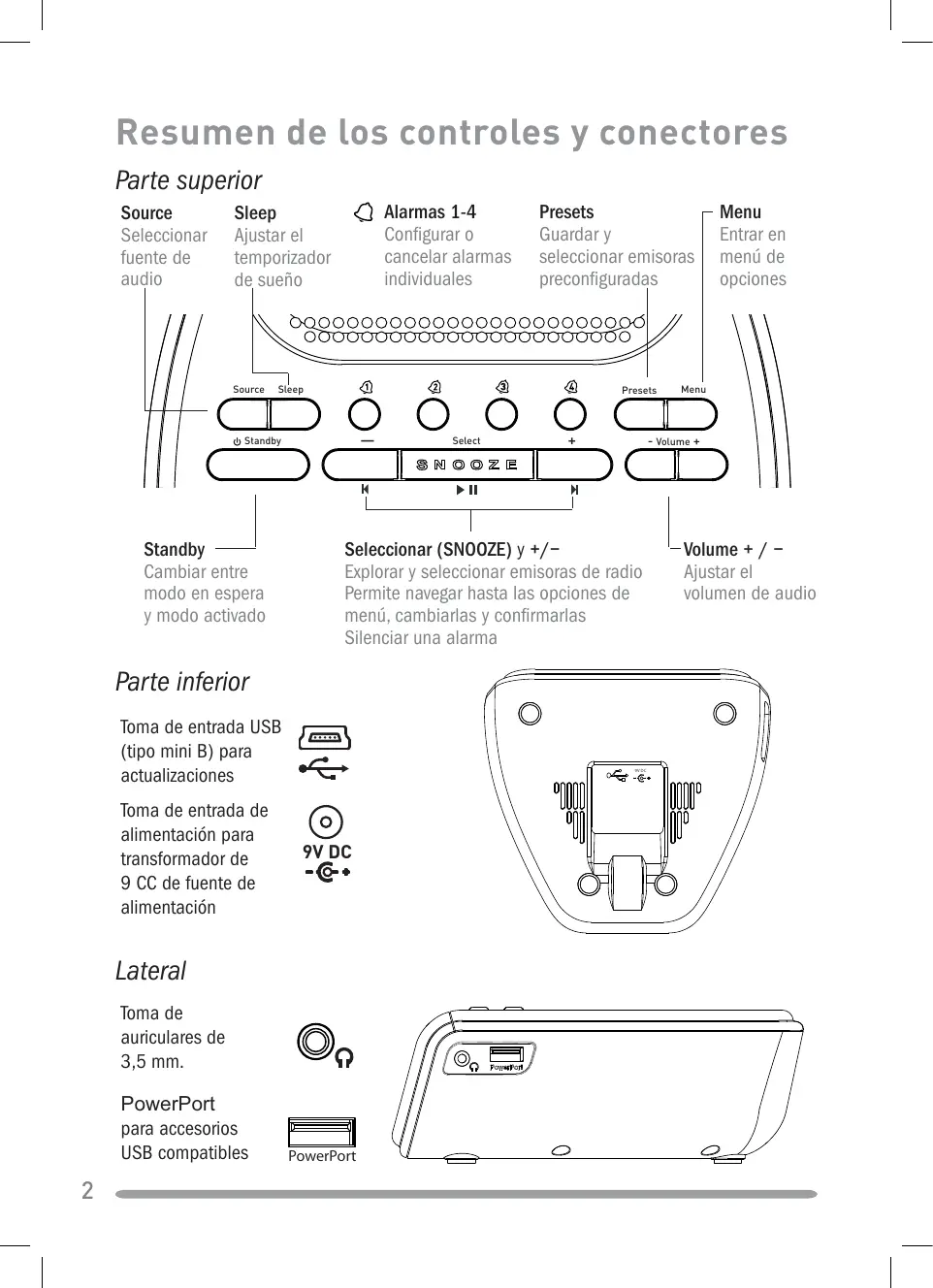 Resumen de los controles y conectores Parte superior Source Seleccionar fuente de audio Alarmas 1-4 Configurar o cancelar alarmas individuales Sleep Ajustar el temporizador de sueño Source