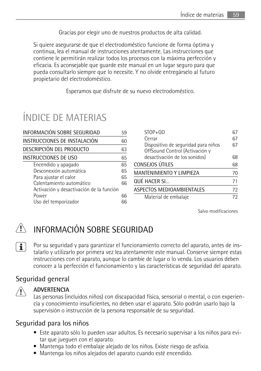 INFORMACIÓN SOBRE SEGURIDAD Por su seguridad y para garantizar el funcionamiento correcto del aparato, antes de instalarlo y utilizarlo por primera vez lea atentamente este manual. Conserve siempre estas instrucciones con el aparato, aunque lo cambie de lugar o lo venda. Los usuarios deben conocer a la perfección el funcionamiento y las características de seguridad del aparato.
